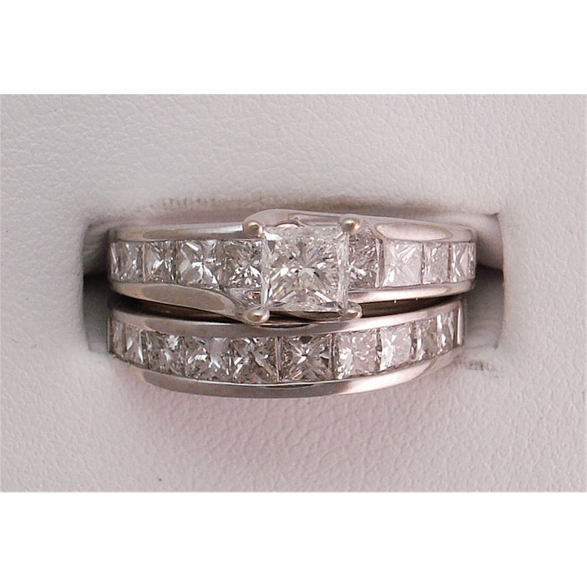 14k white gold Diamond Wedding Set. Two rings, both size 6 1/2. Previously worn, but still looks like new. Center diamond is a Princess Cut, measuring 4.2 x 4.8 mm for a weight of .50+ approximately. The ring also contains 11 channel set princess cut diamonds. The matching band contains 10 channel set princess cut diamonds. Total diamond weight is approximately 2.5 ct total weight for both rings together. Diamonds are clean and bright, you will be thrilled with this ring! You would expect to pay $5000 retail for this set.