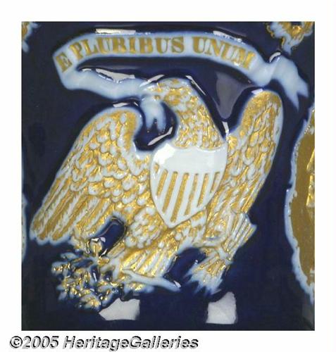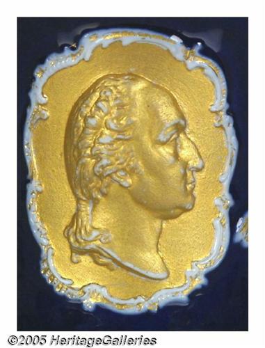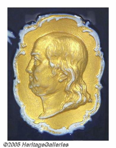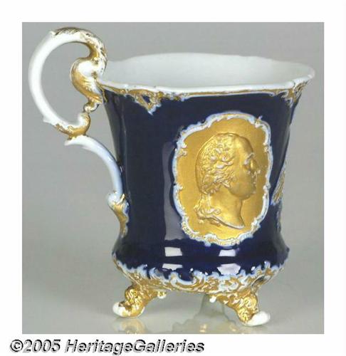 <B>Stunning Early Benjamin Franklin--George Washington Meissen Porcelain Footed Cup</B></I> Probably dating from late in the second quarter of the 19th century. Gorgeous ornate gilded high-relief busts and trim, with patriotic eagle between; one of the most beautiful such items we have ever seen! Minor wear on the gilding (easily restored if one felt the need), otherwise near-mint condition. Height 5 1/4", diameter including handle 5.125". Lot:255