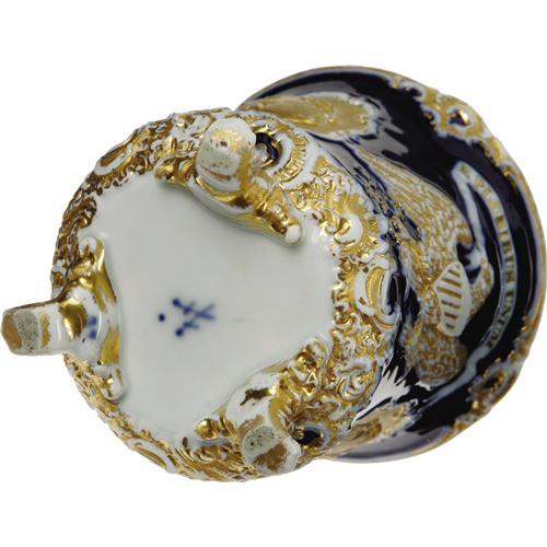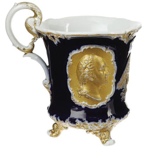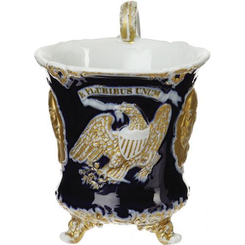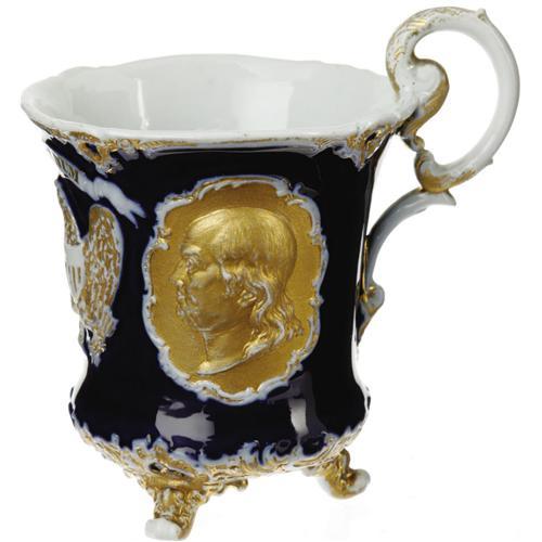 <B>Stunning Early Benjamin Franklin / George Washington Meissen Porcelain Footed Cup.</B></I> Probably dating from late in the second quarter of the 19th century. Gorgeous ornate gilded high-relief busts and trim, with patriotic eagle between; one of the most beautiful such items we have ever seen! Minor wear on the gilding (easily restored if one felt the need), otherwise near-mint condition. Height 5.25", diameter including handle 5.125".