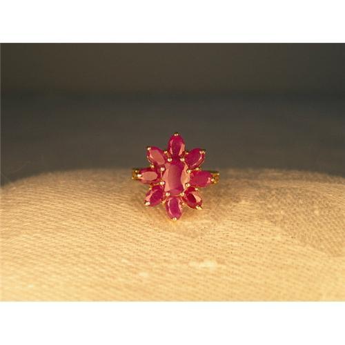 You are looking at stunning estate 14K yellow gold filigree ruby ring. There are 9 natural rubies in this unique piece that create a beautiful flower. The center ruby measures 5 mm long by 4 mm wide. Each of the other 8 rubies measures 3 mm long by 2 mm wide. The top of the ring measures 5/8 of an inch long by 5/8 of an inch wide. The ring is a size 6. Sizing is available. It weighs 3.5 grams. It is in mint condition.