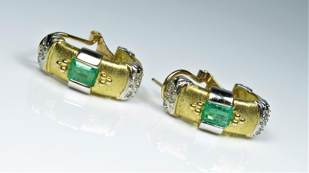 Earrings featuring 2 matching Emeralds weighing approx. 1.50 carats total accented with fine Diamonds set in 14 karat yellow gold custom designer style earrings. Retail $4,000-$6,000
