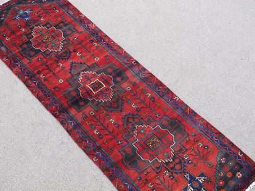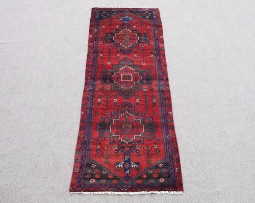 Rug: Handmade Semi Antique Persian Hamadan Rug; Material: Fine quality baby lamb's wool pile, all natural vegetable dye; Size: 9.4 x 3.0 feet; Foundation: Cotton; Design: Persian Hamadan; Origin: Iran