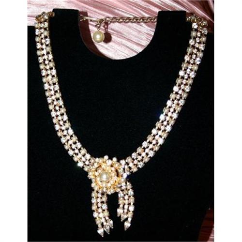 This Stunning Goldtoned Necklace with Prong Set pear shaped, round clear rhinestones and pearly beads. It measures up to 17 1/2" long x 2 3/4" at the center and is signed HOBE in a circle on the back. As this is a vintage piece, it has been worn, some age is present as pictured including some wear to the back plating and very few of the stones are starting to fade but minimal at the very least. An Incredible Find, please view and zoom to enjoy, serious inquiries are welcome!