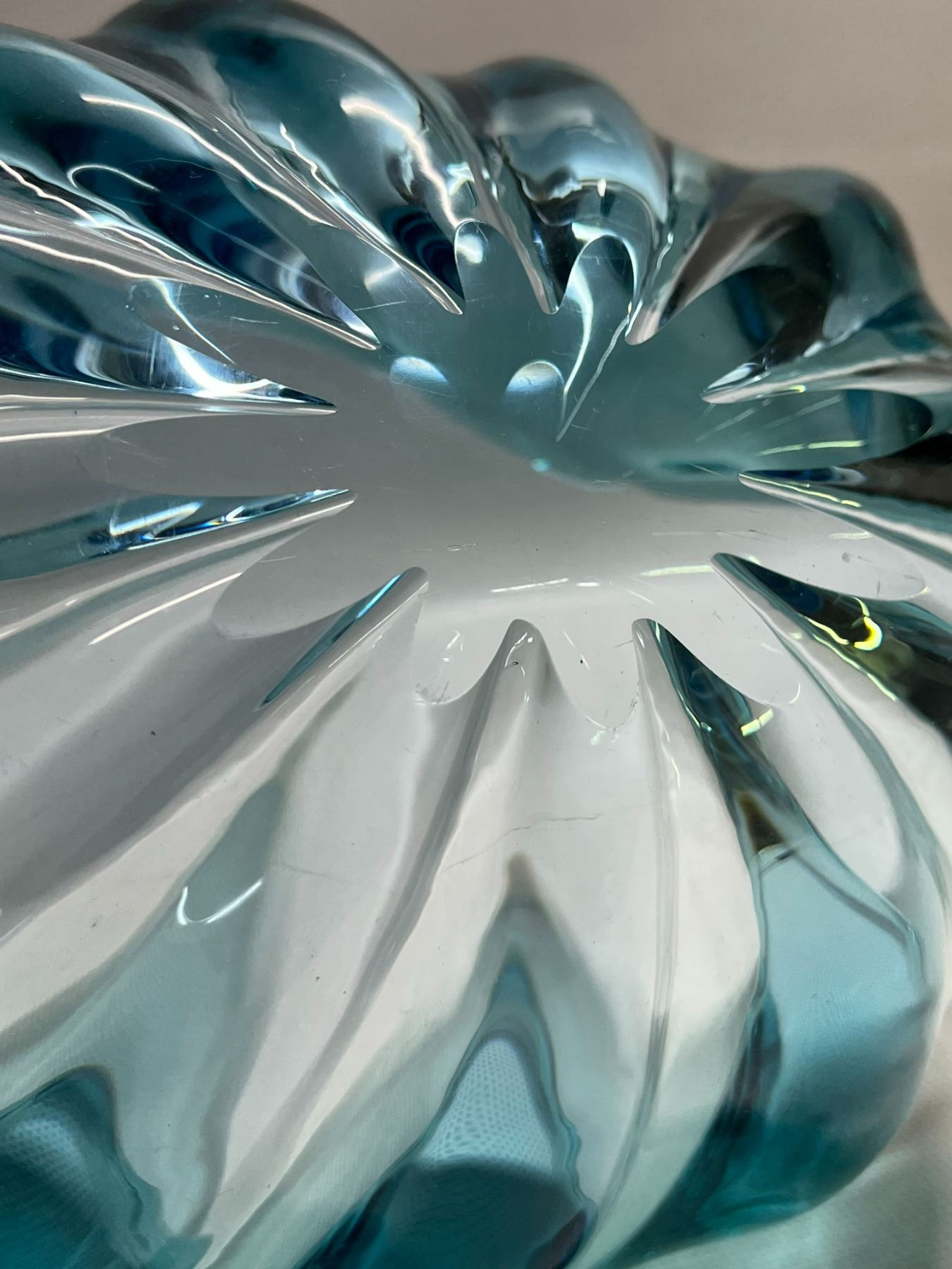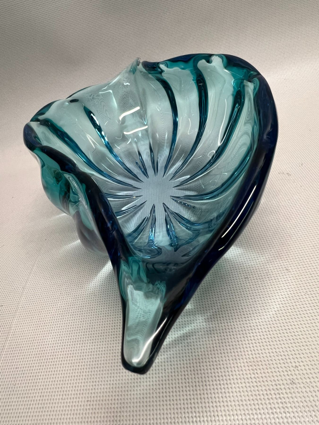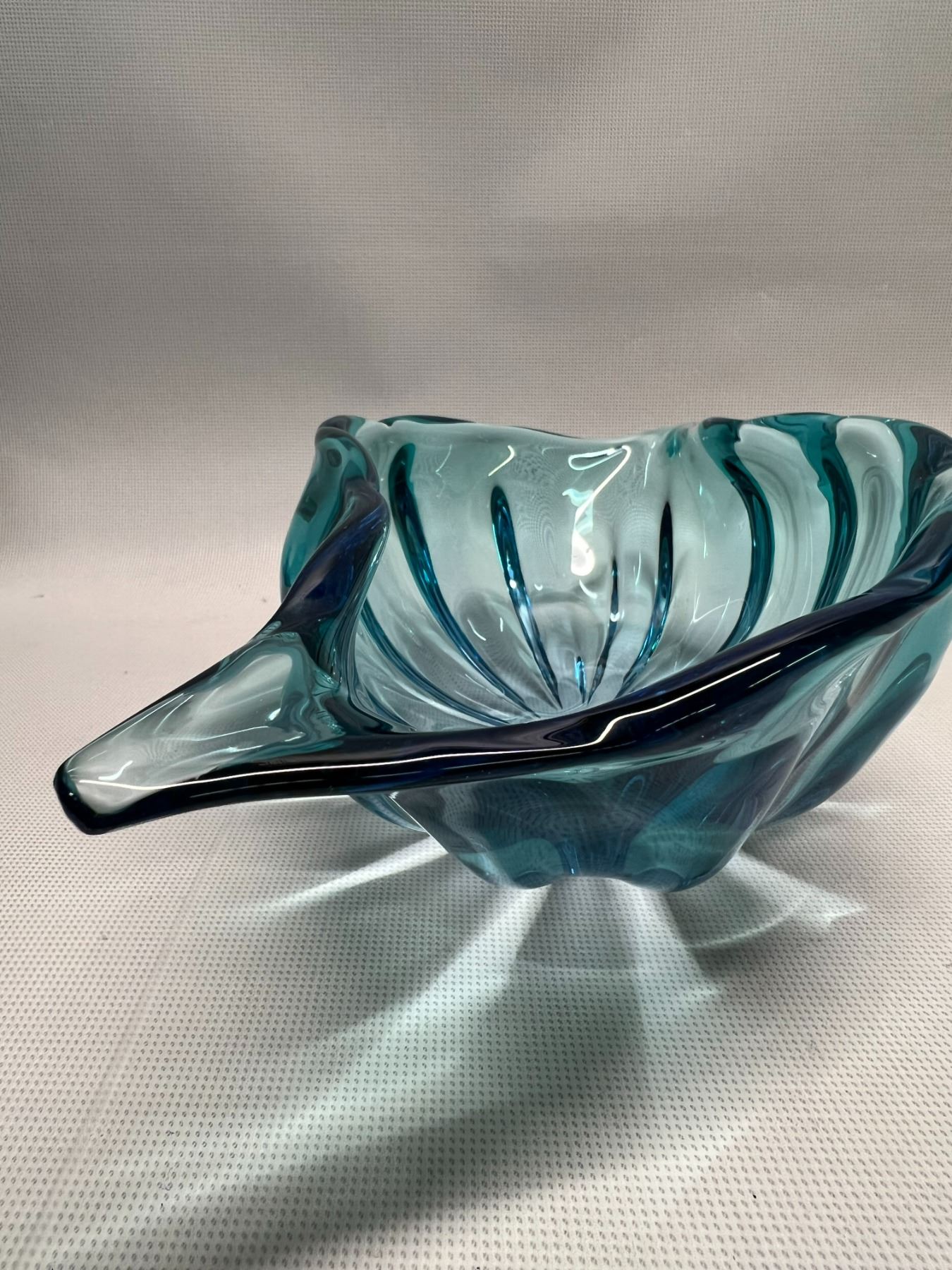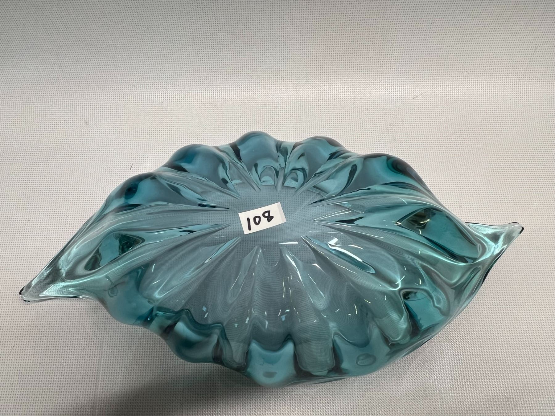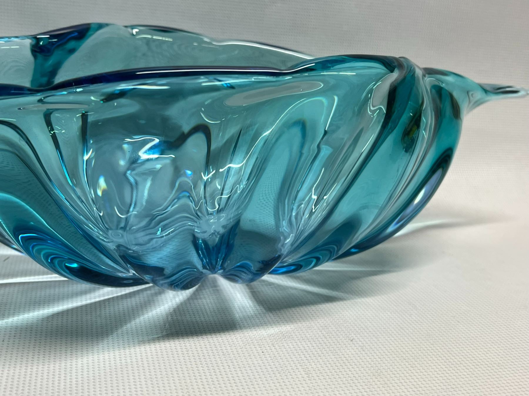 Great shades of blue on this larger piece. Excellent overall condition. Not signed. Stunning Large Blue Heavy Art Glass Centrepiece (approx: 17.5"W 5"T)