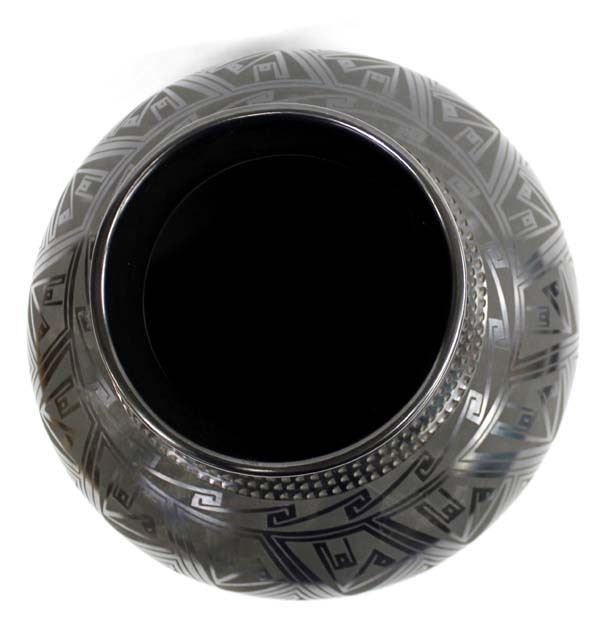 Nupp Estate: Stunning Mata Ortiz Pottery Jar by Armando Silveira, measures 9''H x 10''D, textured neck, flared rim, beautiful black on black geometric designs, nice thick walled piece