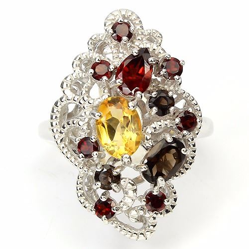 CITRINE, MOZAMBIQUE GARNET & SMOKY QUARTZ (NATURAL) 14K WHITE GOLD PLATED 925 SILVER RING; FACE RING 28.0 X 18.0 MM.; color - TOP RICH YELLOW, TOP RICH ORANGE & TOP SMOKY....IF/VVS quality/ natural earth mined gems; total weight 26.76 carats....ring size 7.5