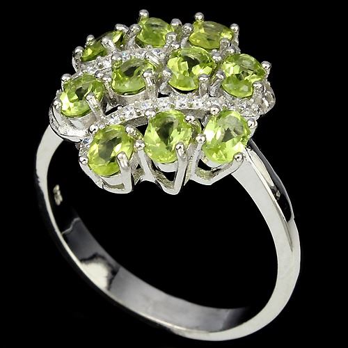 PERIDOT (NATURAL) & CUBIC ZIRCONIA 14K WHITE GOLD PLATED 925 SILVER RING;UNIT OF ITEM (S):1 PIECE;WEIGHT (CT.):21.25 CT. (total weight of silver + stone);DIMENSION:* STONE 4.0 X 3.0 MM. * CZ 1.0 MM. * RING ; SIZE 9.0 * FACE RING 16.0 X 15.0 MM.;SHAPE/CUT:OVAL FACET & ROUND DIAMOND CUT;COLOR:TOP RICH GREEN & AAA WHITE;CLARITY/GRADE:IF TO VVS;LUSTER:GORGEOUS;TREATMENT:UNHEATED;ORIGIN:PAKISTAN;HARDNESS:6.5 - 7.0