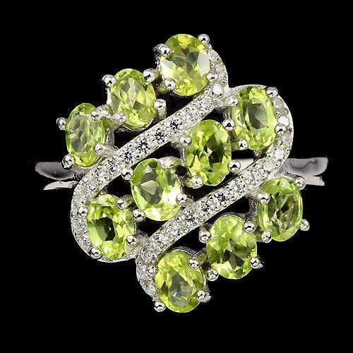 PERIDOT (NATURAL) & CUBIC ZIRCONIA 14K WHITE GOLD PLATED 925 SILVER RING;UNIT OF ITEM (S):1 PIECE;WEIGHT (CT.):21.25 CT. (total weight of silver + stone);DIMENSION:* STONE 4.0 X 3.0 MM. * CZ 1.0 MM. * RING ; SIZE 9.0 * FACE RING 16.0 X 15.0 MM.;SHAPE/CUT:OVAL FACET & ROUND DIAMOND CUT;COLOR:TOP RICH GREEN & AAA WHITE;CLARITY/GRADE:IF TO VVS;LUSTER:GORGEOUS;TREATMENT:UNHEATED;ORIGIN:PAKISTAN;HARDNESS:6.5 - 7.0