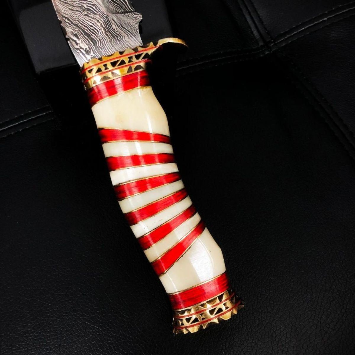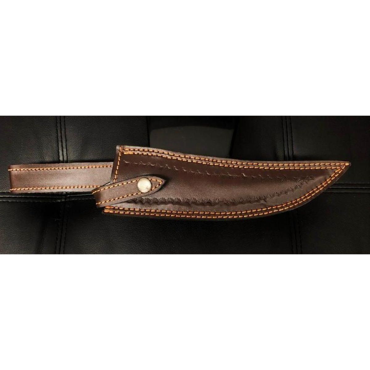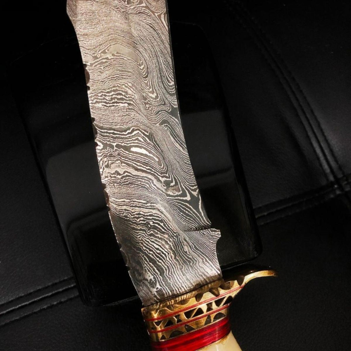High Quality steel is utilized to forge the finest product in the world. Unique Custom Hand-Forged Damascus Steel Hunting Bowie Knife Handle Construction: Camel Bone, Colored Wood and Brass Spacers. Blade Construction: This superbly designed hunting knife is fully hand made. The Blade is crafted by hand forging 216 Layers of 1095 and 15N20 high carbon tool steels, with Nickle layer. Blade has been given excellent heat treatment to get a 56 to 57 HRC. Blade has a razor sharp edge. Sheath Construction: High Quality Thick Leather Specs: Total Length: 12" Blade: 7" Handle: 5"