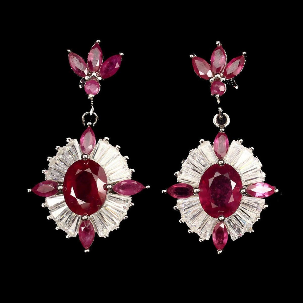 925 STERLING SILVER;PLATE.....14K WHITE GOLD;MAIN STONE...RUBY;OTHER GEMS...CUBIC ZIRCONIA;TOTAL WEIGHT....41.84 CT (TOTAL WEIGHT OF SILVER + STONE)DIMENSION* STONE 2.5 TO 9.0 X 7.0 MM. * CZ 4.0 X 2.0 MM. * FACE EARRINGS 34.0 X 20.0 MM.;MAIN STONE SHAPE-OVAL CUT.;MAIN STONE COLOR-TOP RICH RED;TREATMENT-Yes;ORIGIN-MOZAMBIQUE;HARDNESS-9;