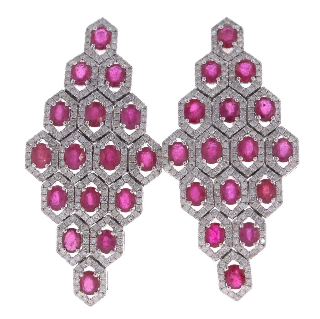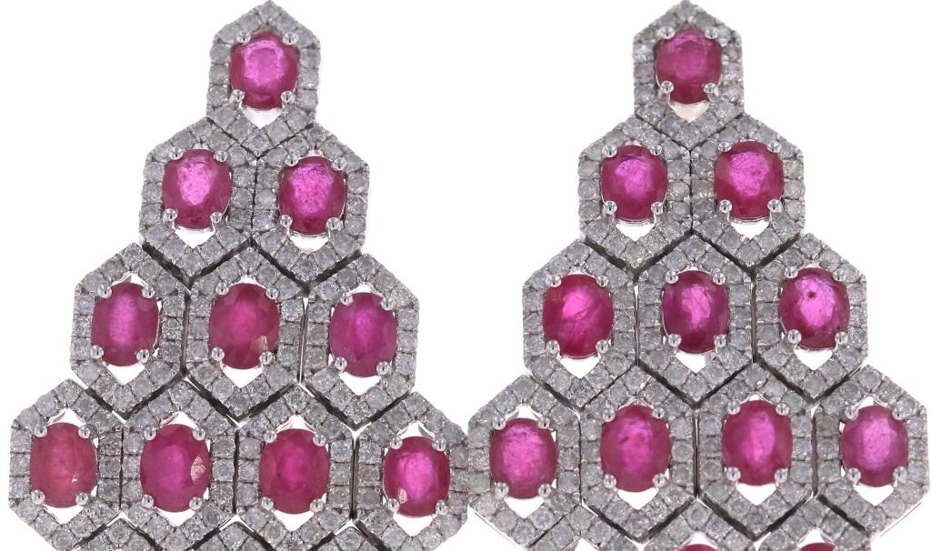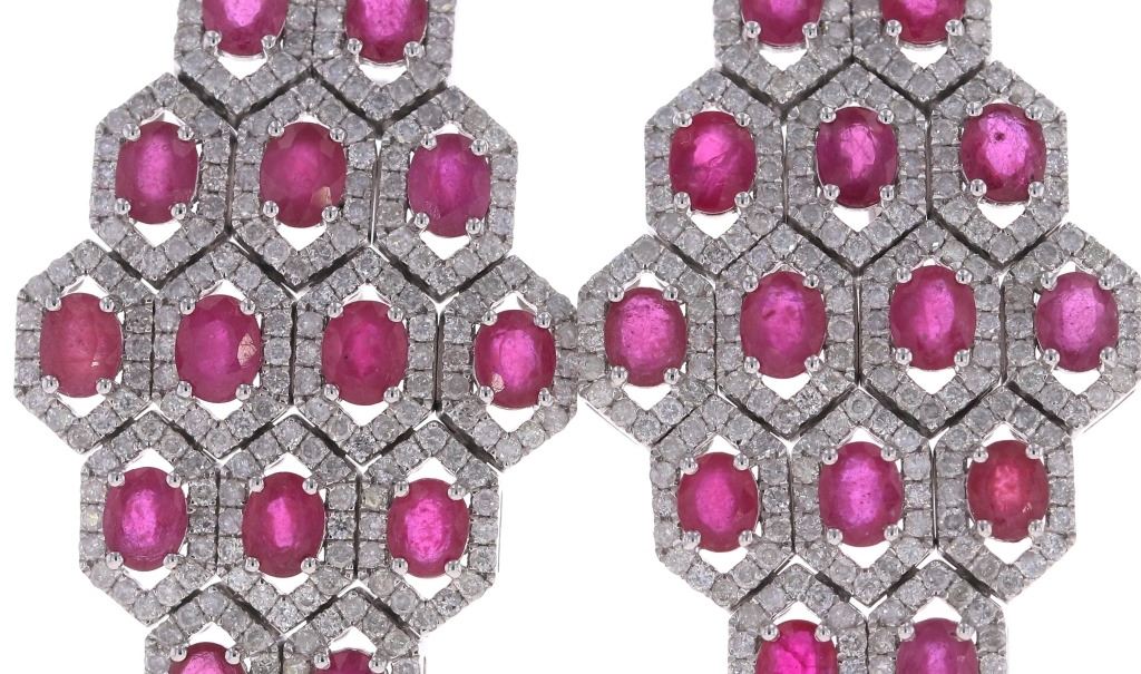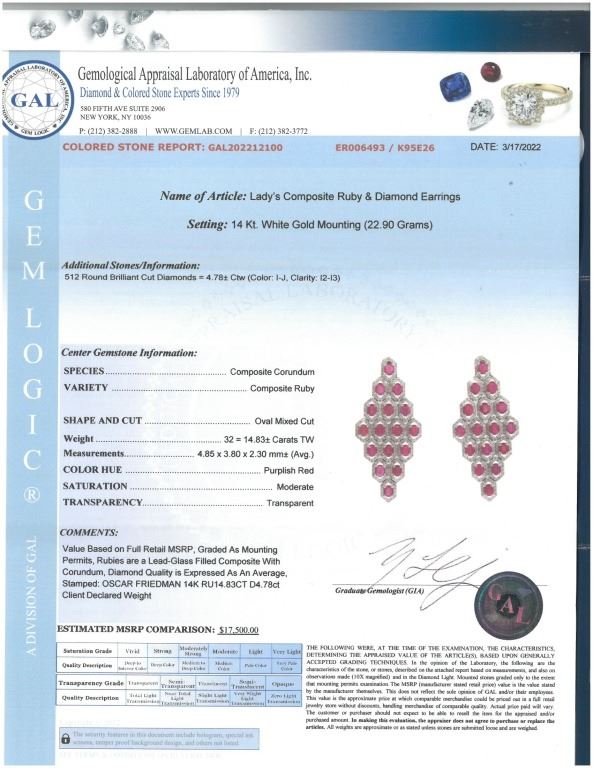 Featured in this lot is this stunning composite ruby diamond and 14k white gold earrings with GAL paperwork. The earrings feature a 14k white gold vintage design. The earrings are decorated with a total of 32 oval mixed cut composite rubies with measurements of 4.85 x 3.80 x 2.30mm and a total weight of 14.83cts and a moderate saturation with a coloration of purplish red and are transparent. The rubies are decorated with a total of 512 round brilliant cut diamonds with a total weight of 4.78ct and a clarity of I2-I3 and a coloration of I-J. The piece comes complete with GAL(Gemological Appraisal Laboratory of America, Inc., a GIA certified lab GAL Appraisal Number#: GAL202212100) report and appraisal confirming the above info and giving a total value of $17,500.00.