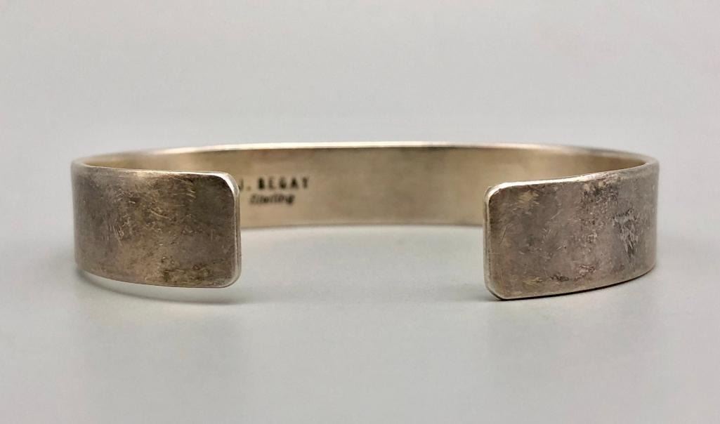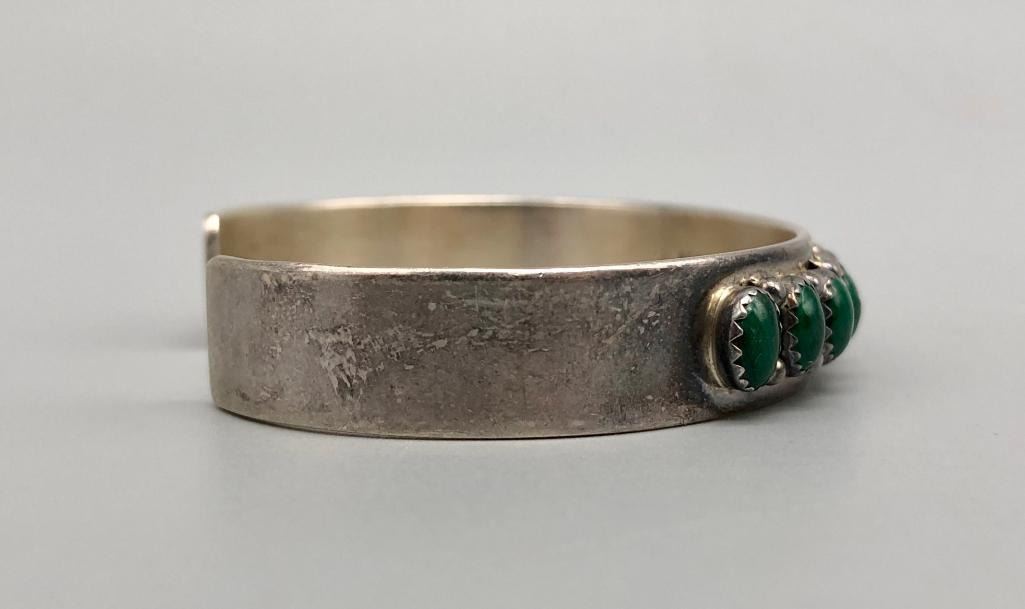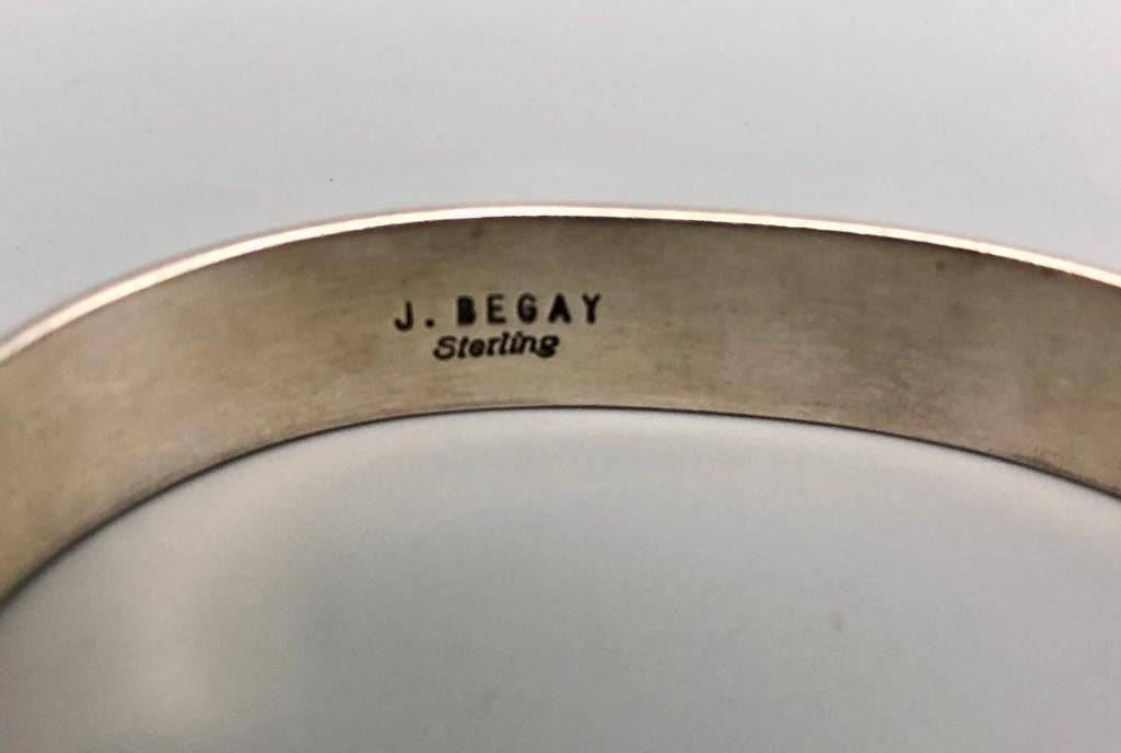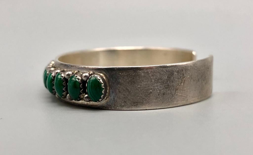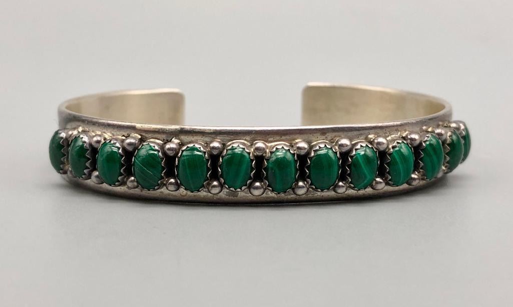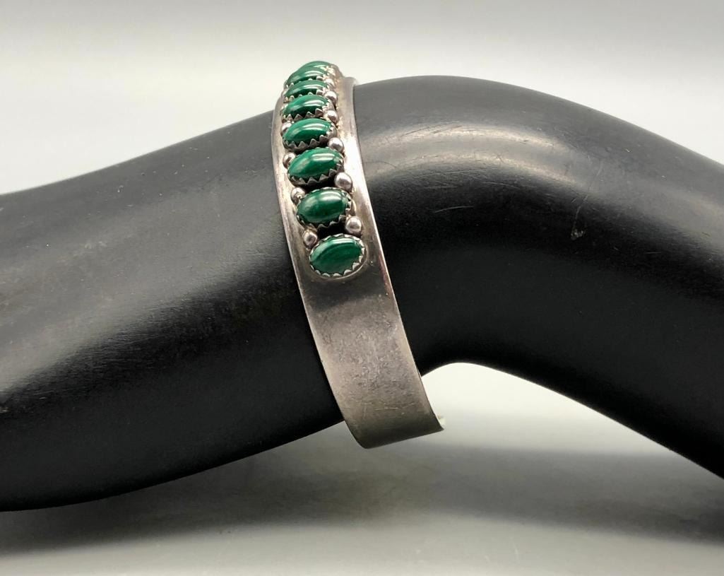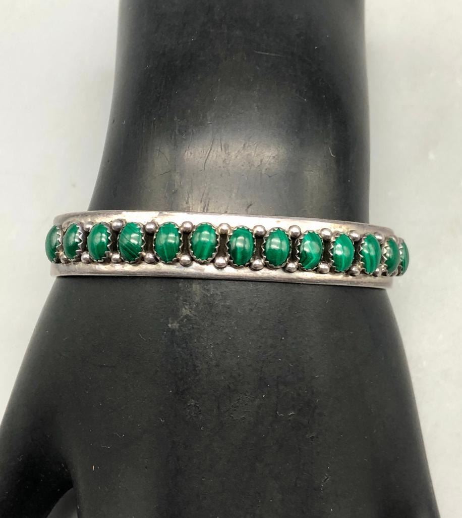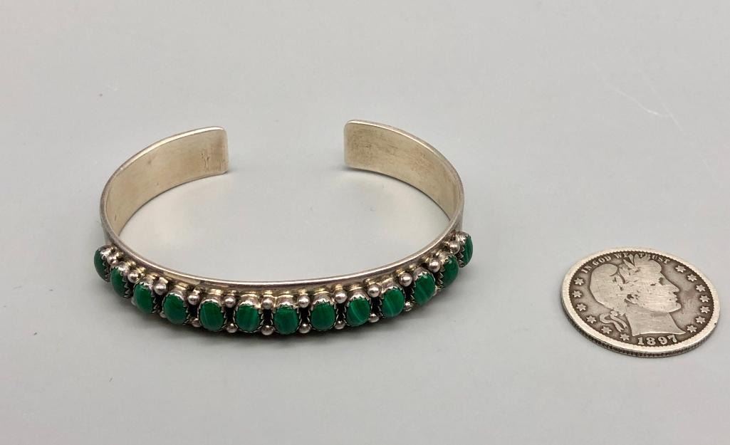 Up for consideration is this stunning sterling silver and malachite bracelet by J. Begay. It is set with 13 small malachite cabochons with lovely dot accents. This is a nice bracelet, perfect to wear every day or stack with other great pieces. Stamped a sterling. MAKER/ARTIST: Hallmarked J. Begay. Jerome Begay (Navajo). Active since the 1970s. APPROX AGE: Circa 1970s. SIZE: Inside circumference measures 5-3/8 inches long. Opening is an additional 3/4 inches, fitting a 6-1/8 inch wrist. Width is 3/8 inches. Weighs 22.1 grams. CONDITION: Good for its age, normal wear expected. Please look closely at the pictures as they are an important part of our description and are hereby incorporated into the description, specifically with regards to condition. SHIPPING: There will be a $5 handling / packaging fee for shipping this lot. The actual cost of postage will be added on top of that. BUY IT NOW: If you would like to buy this item now, without waiting for the auction day to bid on it, we do offer this option (which is available up to 48 hours before the actual auction starts). The “Buy it Now†price is the high estimate of this lot (plus applicable fees and the Buyer's premium is discounted to 10% when using the Buy it Now option). If you would like to exercise this option, you must contact us by email (or phone as long as you talk to someone live). Reference this lot number and your intention to "Buy it Now."