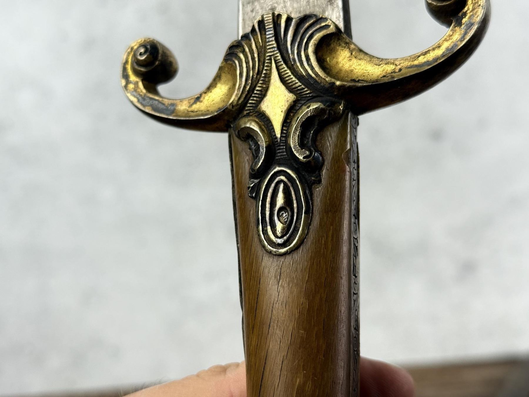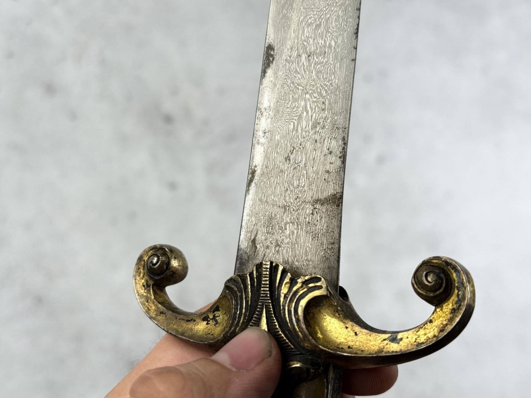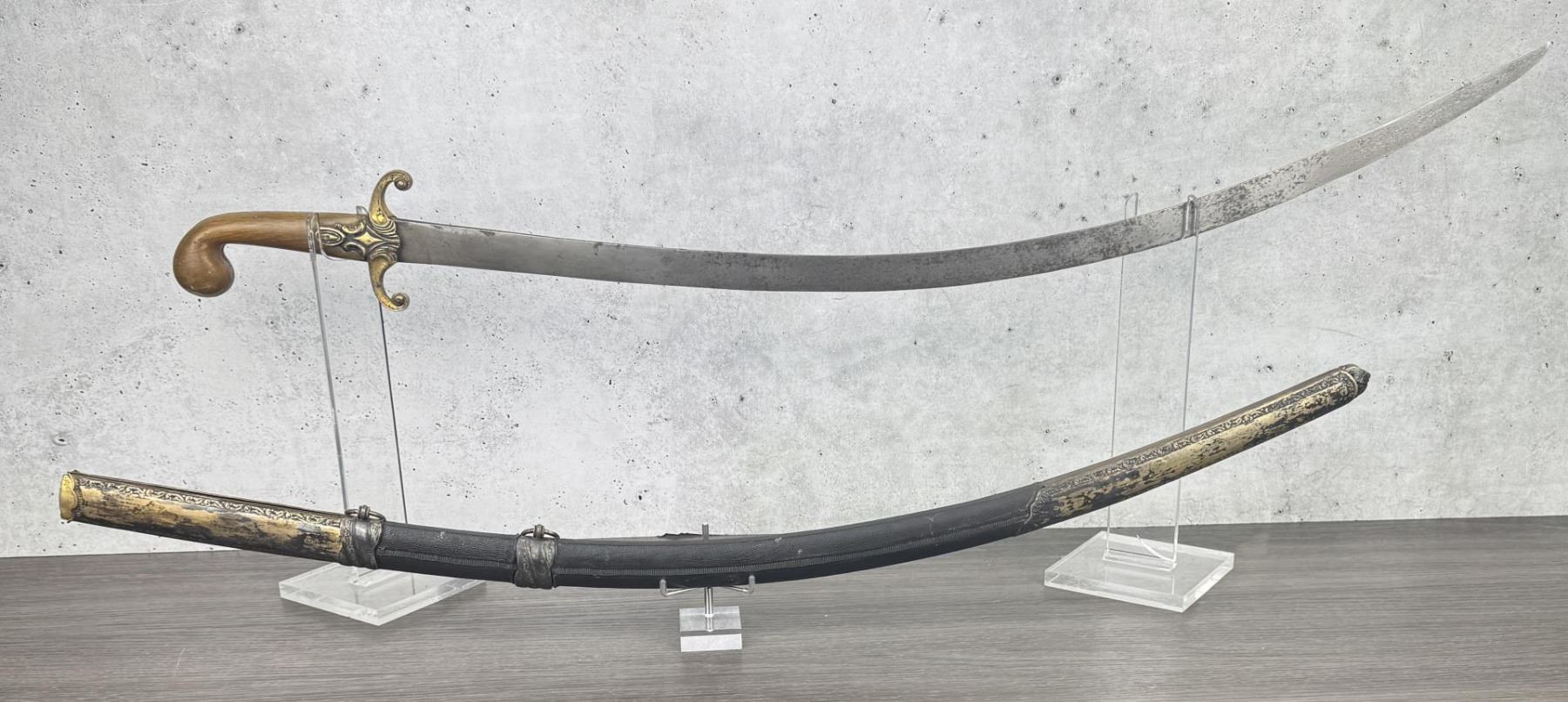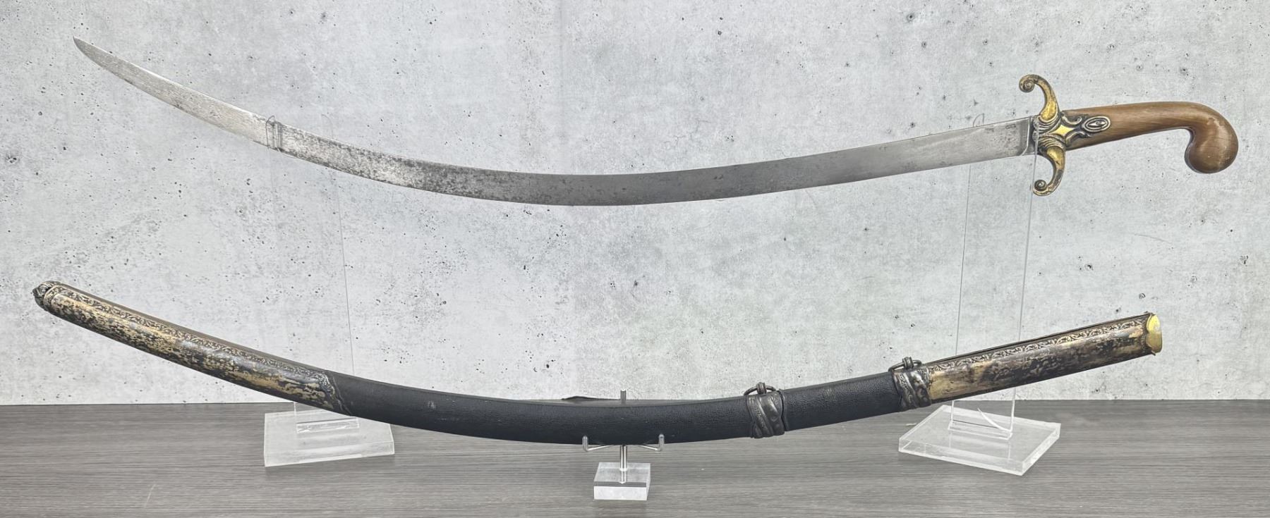 36" long overall. A fine example of an Ottoman Shamshir likely of the Tanzimat era from 1839 to 1876. Wootz steel blade. The nautical style knot suspension loops identify this as a naval sword. Institution quality. Near impossible to find in this quality.