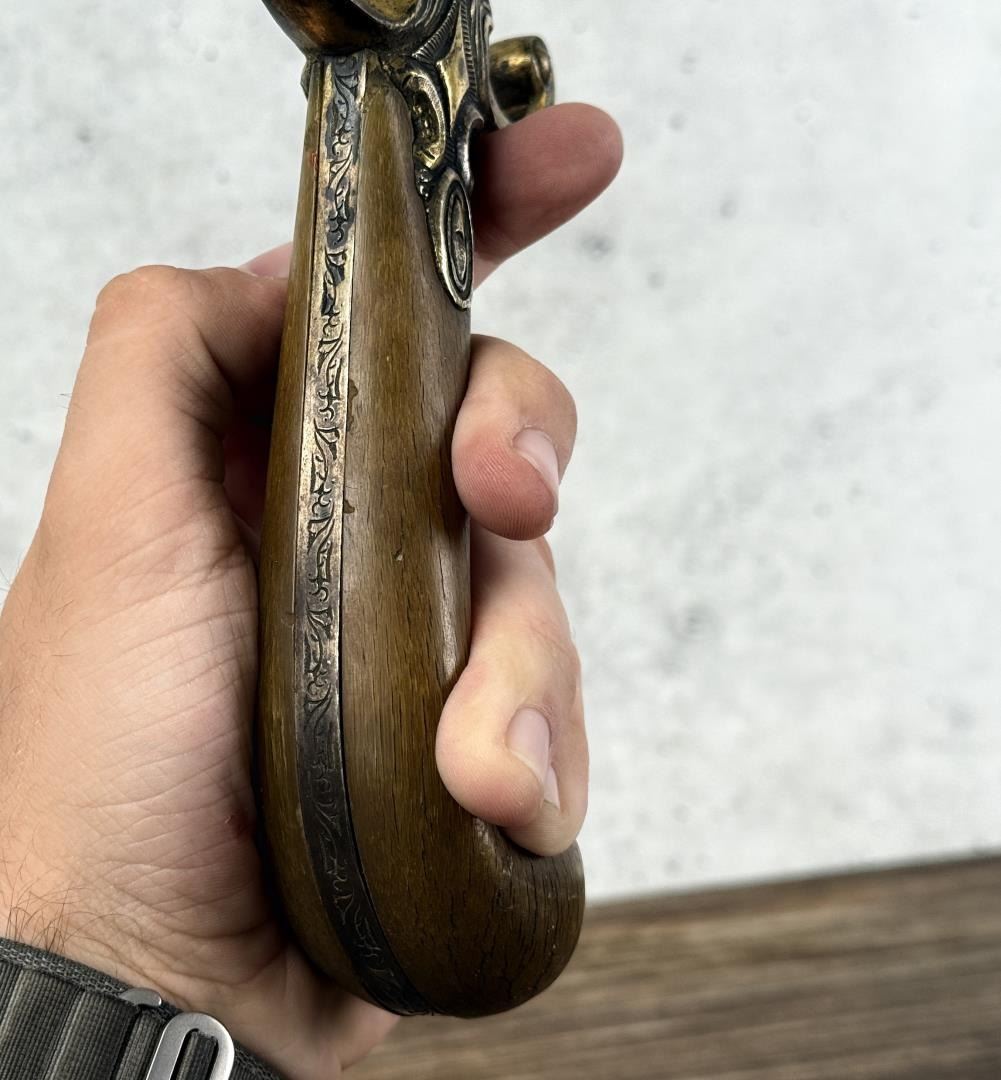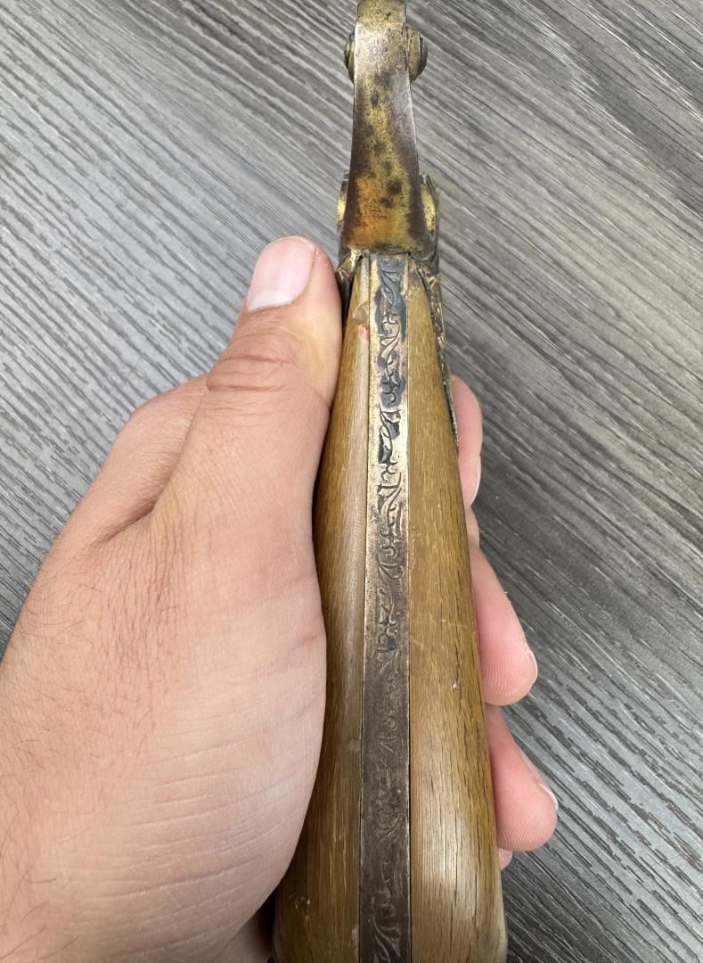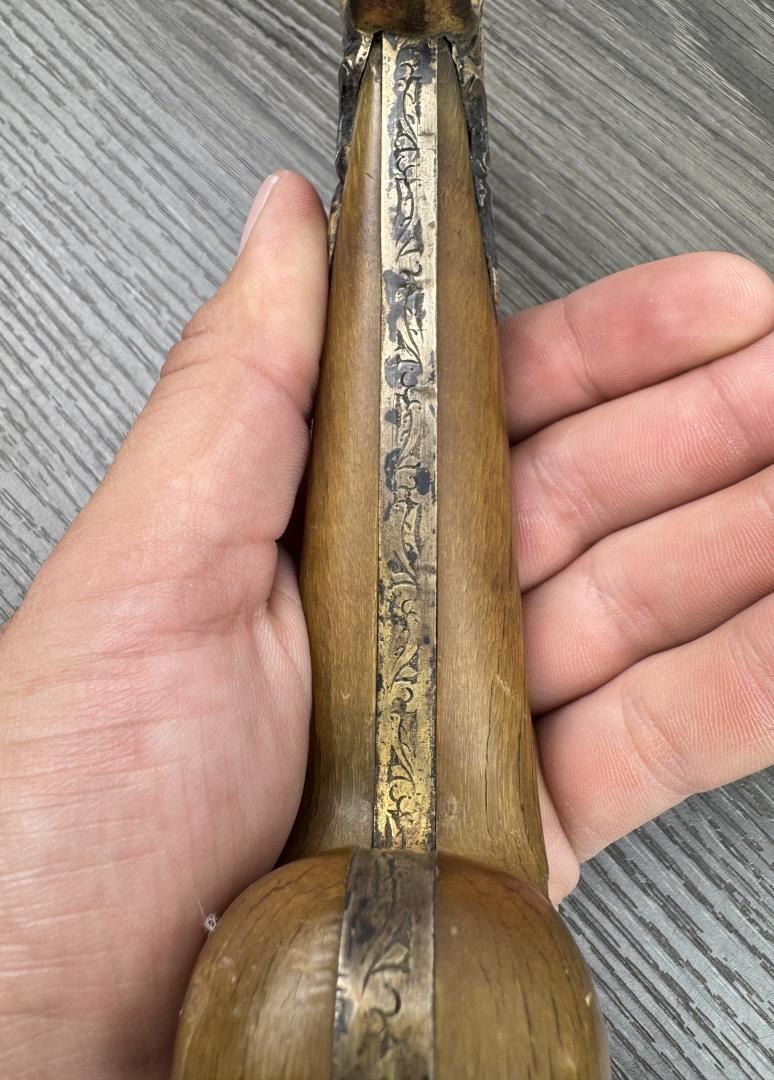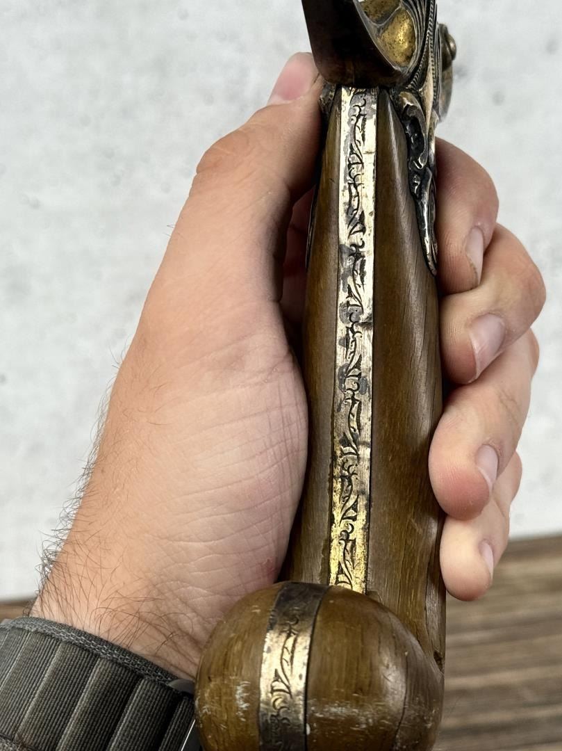 36" long overall. A fine example of an Ottoman Shamshir likely of the Tanzimat era from 1839 to 1876. Wootz steel blade. The nautical style knot suspension loops identify this as a naval sword. Institution quality. Near impossible to find in this quality.