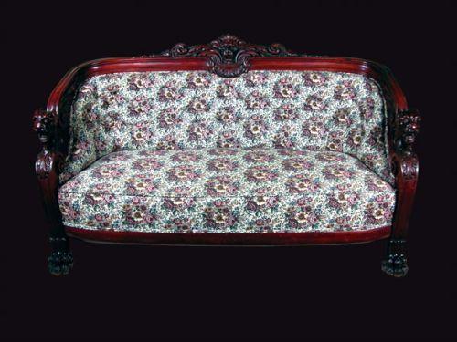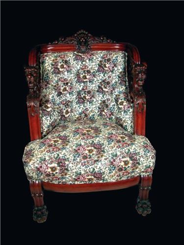Stunning Three Piece Parlor Set with lion head motif on arms and back, chair and sofa by Karpin. Good condition. Sofa 66 wide X 40 tall, chair 27 X 36 and footstool 20 X 12 inches.