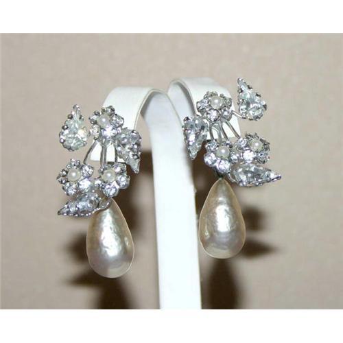 These vintage Glass Pearl and Rhinestone Earrings are absolutely exquisite! Three long stem Flowers created using Chaton Rhinestones with Glass Pearl centers, each surrounded by a large brilliant cut Tear Drop shaped Rhinestone; off the bottom dangles a huge Pearl. All Rhinestones are foil-back and prong set in a Rhodium plated metal. Measuring 2 inches long by 1 inch wide, with the Pearl dangle measuring 1 inch long, securing with a clip-back closure. Exquisite!
