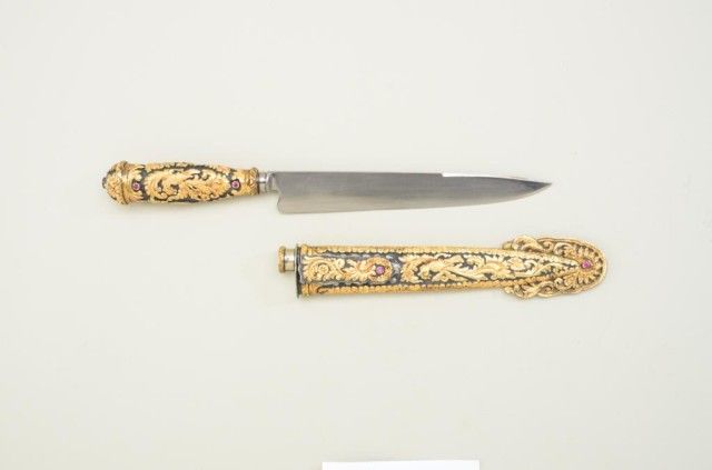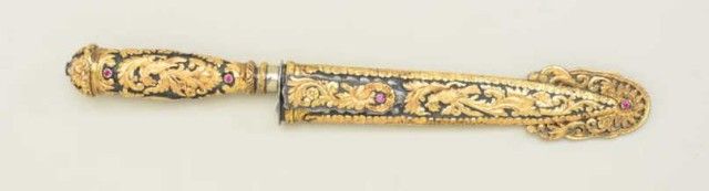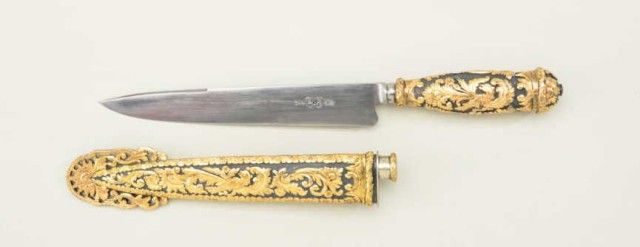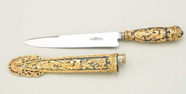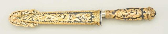 Stunning and elaborate gaucho knife with raised gold on silver decorations with small jewels in its original fitted case showing "F.J. Freccero" makers label with address "Motevideo". Freccero is sometimes calledthe "Tiffany" of South America. The top of the scabbard shows stamped hallmark or makers marks and a small signature, the gold decoration shows birds, florals and elaborate piercings. The knife measures 12-1/4"overall with a 7-1/2" blade. The blade is marked "mca MH rda". The case is fitted in the French style with velvet in the bottom and Moroccan leather covering with satin in top. The case is in good condition, one endhas been re-glued neatly. A stunning piece of male jewelry worthy of any blade collection. Est.;$4,000-$8,000.
