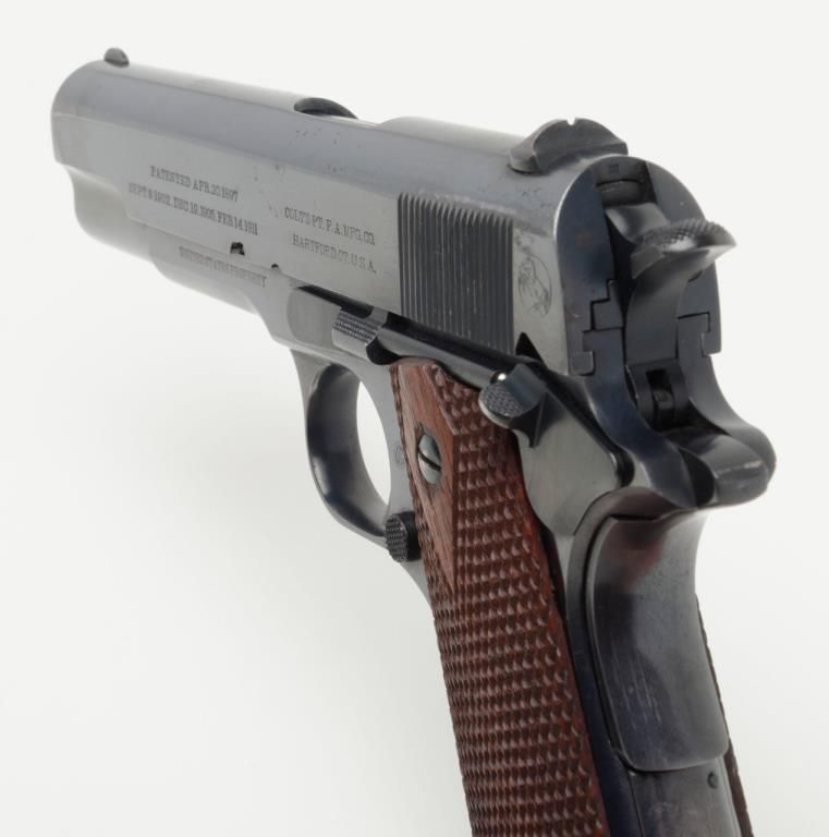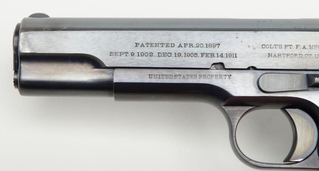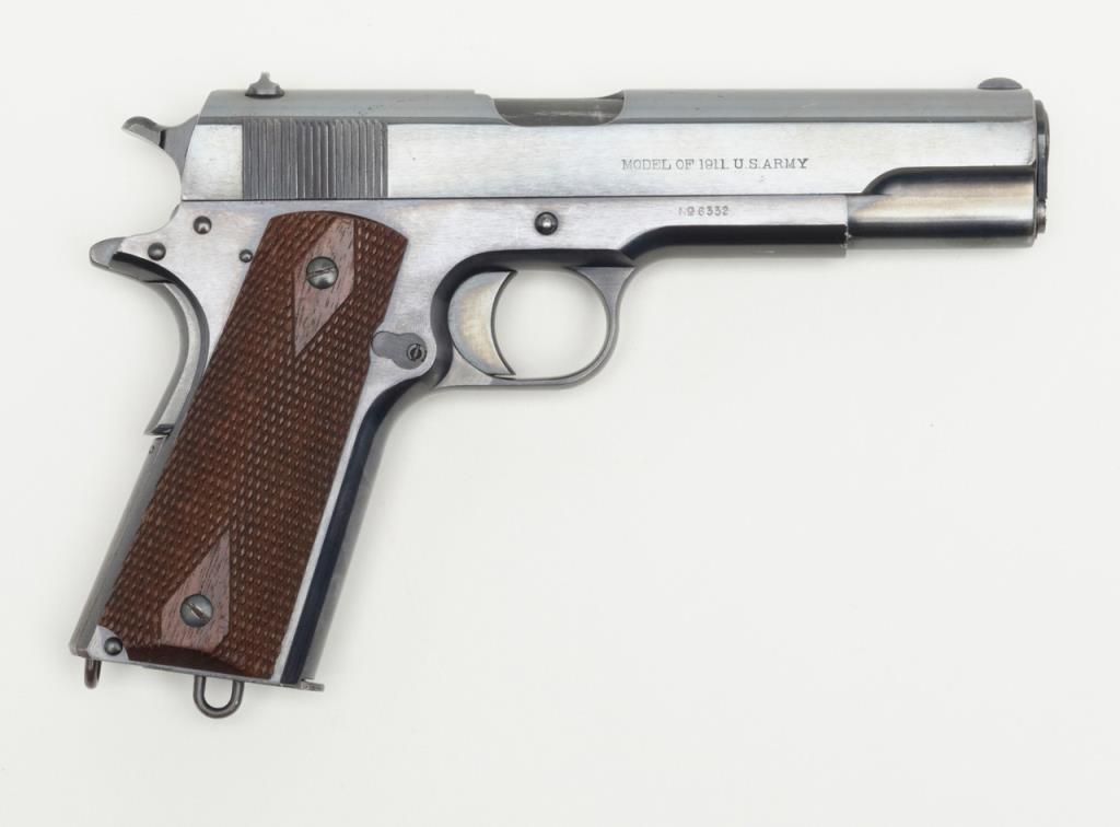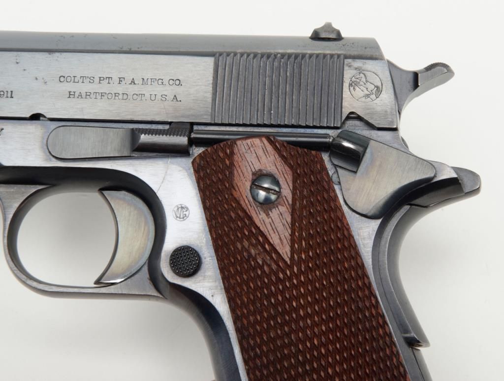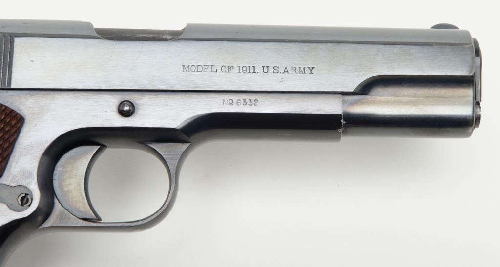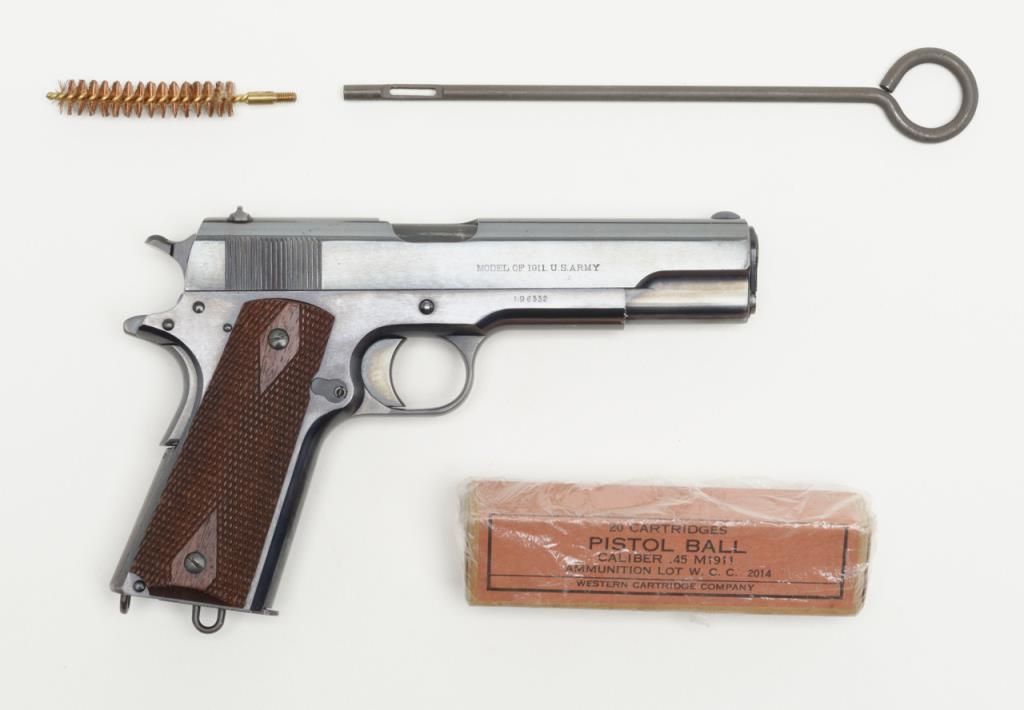 Stunning early United States Property-marked Colt Model 1911 U.S. Army semi-auto pistol, .45 cal., 5” barrel, blue finish, checkered wood grips, two-tone magazine with lanyard ring in base, #6332 in excellent condition showing approx. 96%original high polish blue finish with the majority of loss confined to the backstrap below the grip safety, sharp markings, crisp action, fine bore and fine grips; accompanied by a reproduction Kraft-style cardboard box with cleaning rod,brush, 20 cartridge box of pistol ball cartridges by Western Cartridge Co. and a wood block wrapped in paper to simulate an extra magazine. This first year of production (1912) Model 1911 is one of the best conditioned examples this cataloger hasseen in a number of years and is definitely suitable for any serious private or institutional collection of U.S. military firearms. (C&R). Est.: $7,000-$14,000.