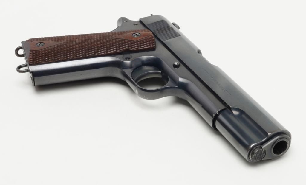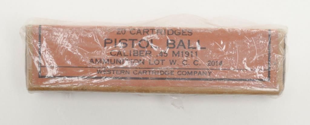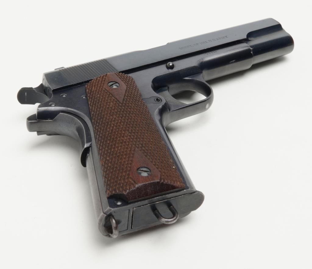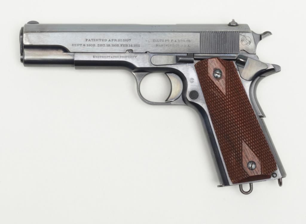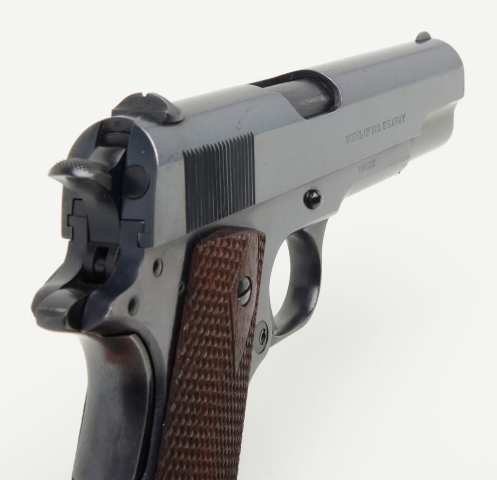 Stunning early United States Property-marked Colt Model 1911 U.S. Army semi-auto pistol, .45 cal., 5” barrel, blue finish, checkered wood grips, two-tone magazine with lanyard ring in base, #6332 in excellent condition showing approx. 96%original high polish blue finish with the majority of loss confined to the backstrap below the grip safety, sharp markings, crisp action, fine bore and fine grips; accompanied by a reproduction Kraft-style cardboard box with cleaning rod,brush, 20 cartridge box of pistol ball cartridges by Western Cartridge Co. and a wood block wrapped in paper to simulate an extra magazine. This first year of production (1912) Model 1911 is one of the best conditioned examples this cataloger hasseen in a number of years and is definitely suitable for any serious private or institutional collection of U.S. military firearms. (C&R). Est.: $7,000-$14,000.