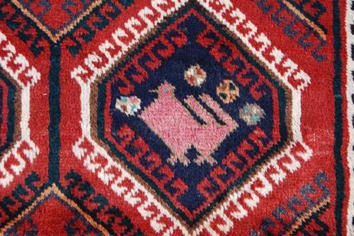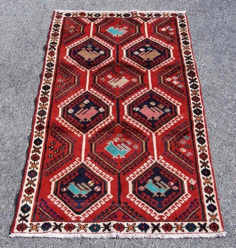 Stunning geometric medallion design Persian Hamedan Rug. Made of 100% baby lambs wool pile on wool foundation. All natural vegetable dye, a nice red background with a nice allover geometric medallion design contrasted nicely with a darker detailed trim. From City of Hamedan in Iran. Size: 3 feet 10 inches X 7 feet 3 inches.