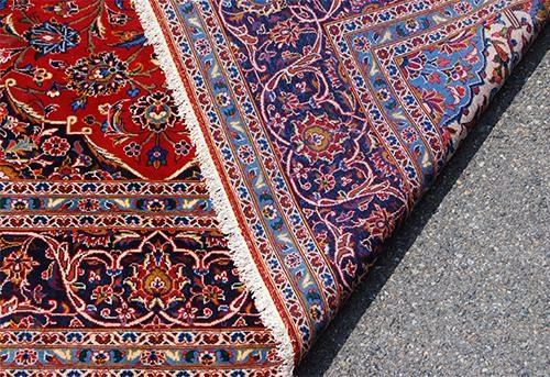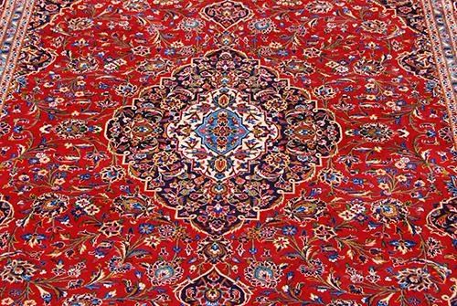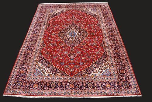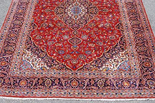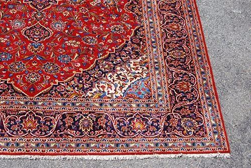 Absolutely breathtaking high quality kashan design Rug. 100% natural, hand woven, vegetable dye, finest baby lamb's wool pile on cotton foundation. This is an exquisite kashan design on a red background with a central medallion and tear drops enhanced with crowned corners of williamsburg blue of utmost beauty. Given the fact that Rugs are product of a desert like environment, it is natural to use primary colors in the majority of the Rugs produced as a means of absorbing the harsh and intense sunlight in order to be soothing on the eyes. Therefor it is rather rare and unusual to come across Rugs with such predominant soft tones. This is an exceptionally intricate and exquisite piece with its beautiful shah-abbasi floral pattern. This high fashion designer Rug can transform any living space into a fabulously inspired interior. This lovely piece has about 100 knots per square inch and it would take over two years to weave this Rug. Creases in this Rug are due to fold and not a defect. Size: 13 feet 1 inch X 9 feet 10 inches.