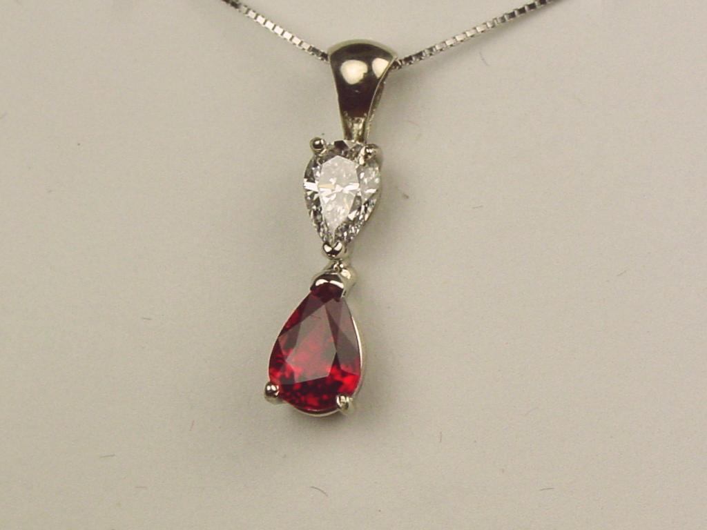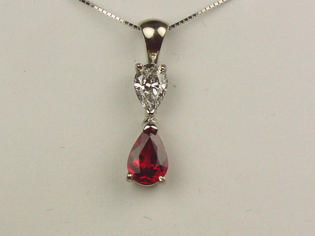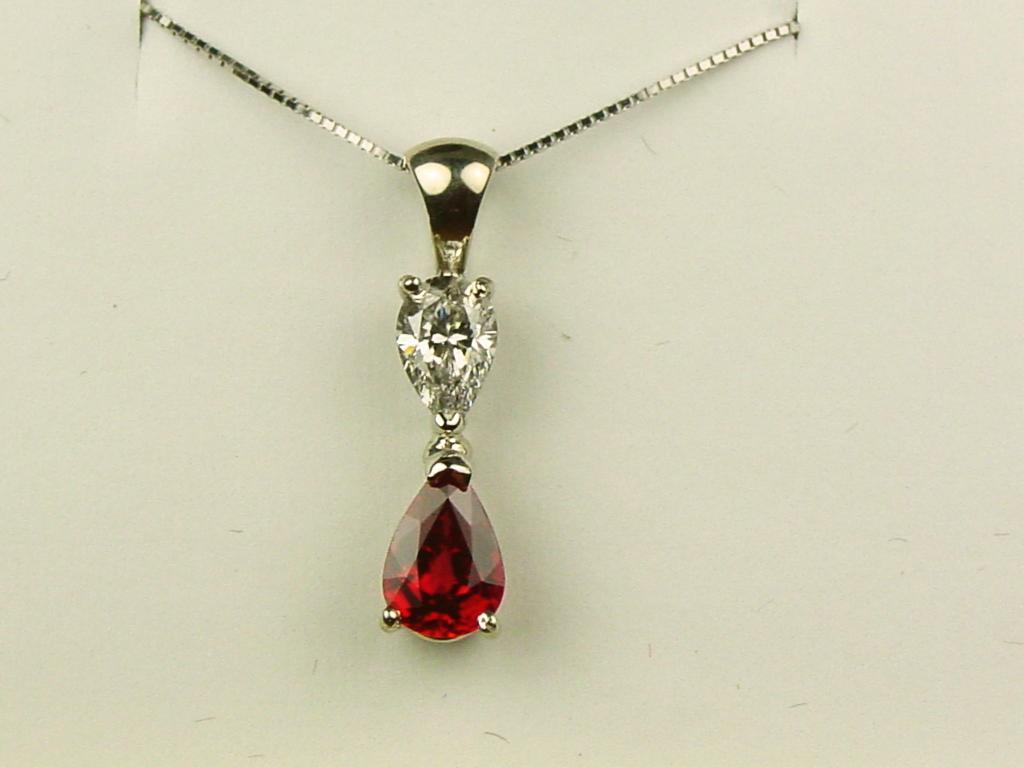 Stunning high quality 14 karat white gold ladies custom made pendant set with an extra fine pear shape blood red Ruby weighing 1.08 carats and a fine pear shape diamond weighing 0.52 carats of F-G color and VS/SI clarity.Retail $7,800.00 Estimate $2,500-$3,500 Please see FULL appraisal