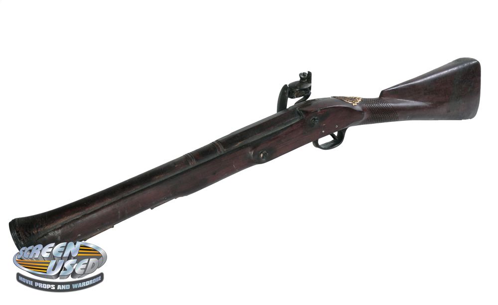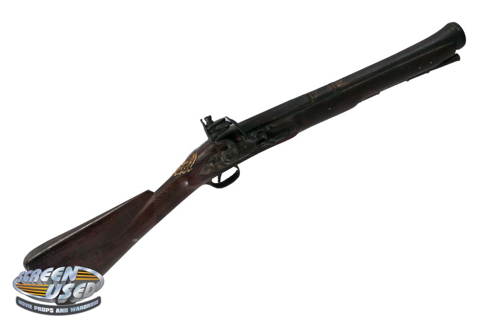 (Disney, 2003) This stunt flintlock blunderbuss was custom-made for the production for use by various actors. The dense rubber blunderbuss features a custom paint scheme, giving the prop the same details seen on the metal version. The piece measures approximately 30" long.