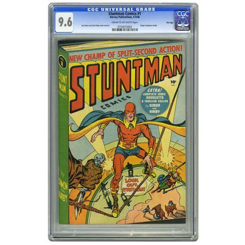 <B>Stuntman Comics #1 File Copy (Harvey, 1946) CGC NM+ 9.6 Cream to off-white pages.</B></I> Here's a spectacular copy of a spectacular book, the first appearance of the Stuntman (the CGC slab incorrectly says "origin retold," this is the first telling of the origin story). The "fake hardback" cover is by a duo who never failed to come up with innovative visuals, namely Simon and Kirby. The interior art is also by S&K. Overstreet 2006 NM- 9.2 value = $1,550. CGC census 3/06: 1 in 9.6, none higher.