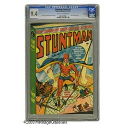 <B>Stuntman Comics #1 File Copy (Harvey, 1946) CGC NM 9.4 Cream to off-white pages.</B></I> Simon and Kirby introduced the Stuntman here, and pulled a nice stunt of their own with this "fake hardback" cover. The interior art is also by S&K. Note that the CGC slab incorrectly says "origin retold"; this is actually the <I>first</B></I> origin of the character and his first appearance. If like a certain other fictional stuntman, you've "never been with anything less than a 9," then this 9.4 copy will satisfy even your high standards. Overstreet 2004 NM- 9.2 value = $1,400. CGC census 12/04: 2 in 9.4, none higher.