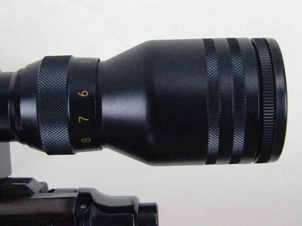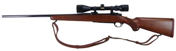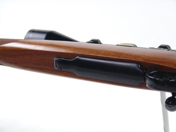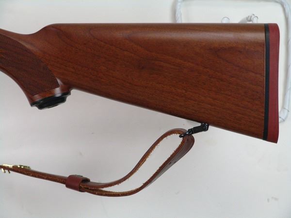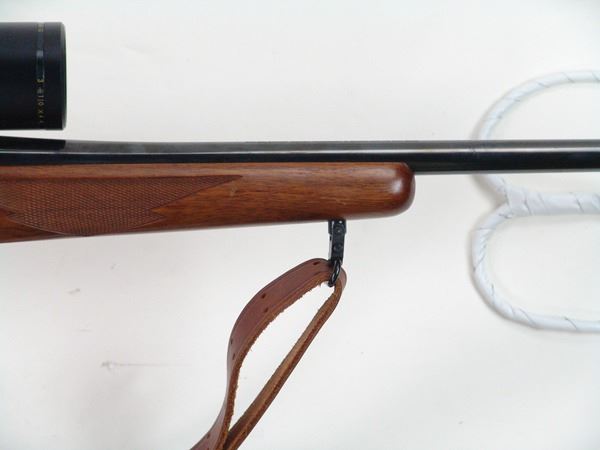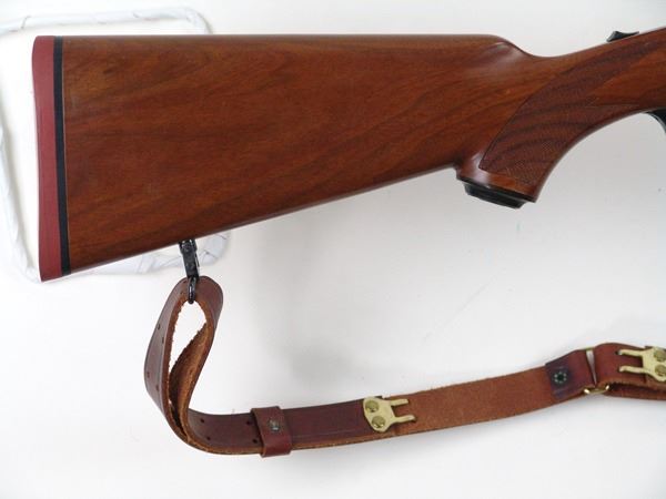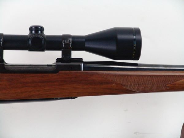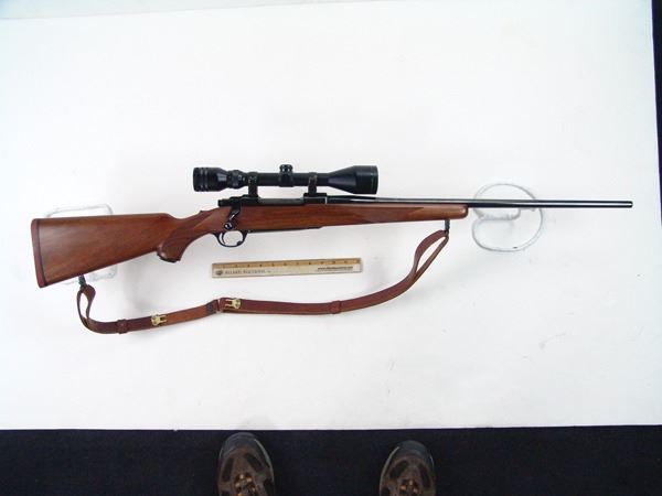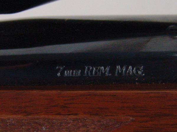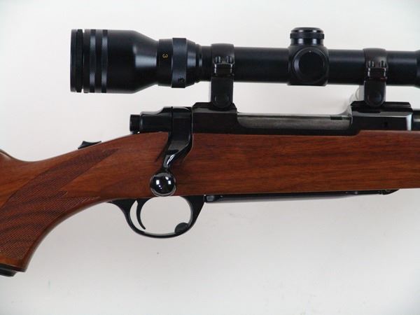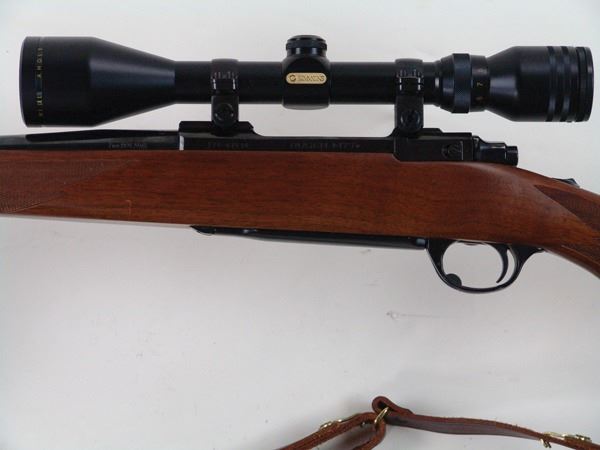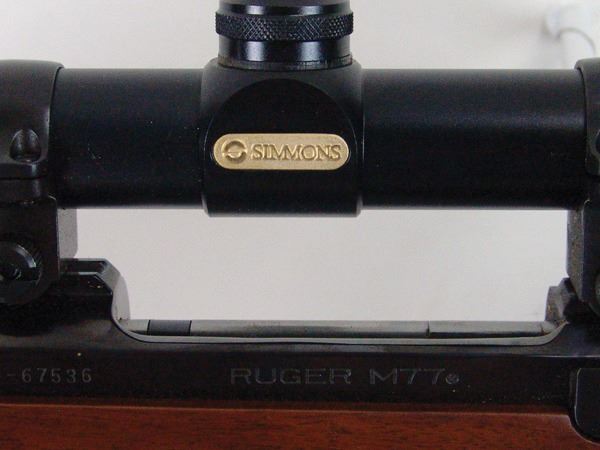 Custom deluxe, 7mm Rem Mag cal. "Ruger M77" rifle with blued, 25" barrel and hardware, checkered one piece walnut stock, and Simmons model 1044 scope. Very good condition. S/N 770-67536.