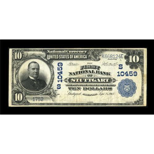 <B>Stuttgart, AR</B></I> - $10 1902 Plain Back Fr. 630 <B>The First NB</B></I> Ch. # (S)10459<BR> A truly rare note from a bank with only three large examples (plus a large uncut sheet) recorded in the census. This piece, newly discovered and hidden in the Kansas City collection for nearly forty years, is a welcome new addition. <B>Very Fine,</B></I> with a small stain in the back margin that really affects nothing. <BR><I>From The Kansas City Collection.</B></I><BR><BR><b>Shipping:</b> Coins & Currency (<a target="_blank" href="http://www.heritageauctions.com/common/shipping.php">view shipping information</a>)