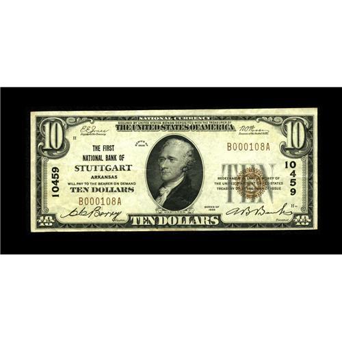 <B>Stuttgart, AR</B></I> - $10 1929 Ty. 1 <B>The First NB</B></I> Ch. # 10459<BR>This is an attractive note we really like. It comes from the only bank in this community of some 10,000 people located NE of Pine Bluff. It offers both grade and plenty of rarity, although not so much that its price will soar out of reach of the average collector, and its combination of eye appeal and desirability makes it an excellent choice for those collectors who just desire to own one better Arkansas item for a state set. Nice <B>Very Fine+.</B></I><BR><BR><b>Shipping:</b> Coin/Currency (<a target="_blank" href="http://www.heritageauctions.com/common/shipping.php">view shipping information</a>)
