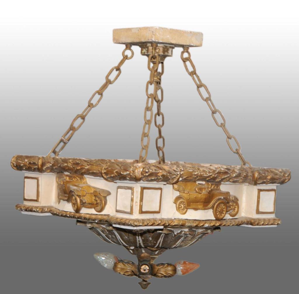 Circa 1915 to 1920. Reportedly came from a Stutz showroom. Neat graphics depict open touring cars shown in central areas. General overall small chips, nicks, wear and soiling. The chain is adjustable allowing fixture to hang anywhere from 24 to 40 inches. Fixture includes hidden light assembly inside for three lights. Decorative Lamp Condition (7.0, Very Good). Size Fixture: 24" x 24" x 18".
