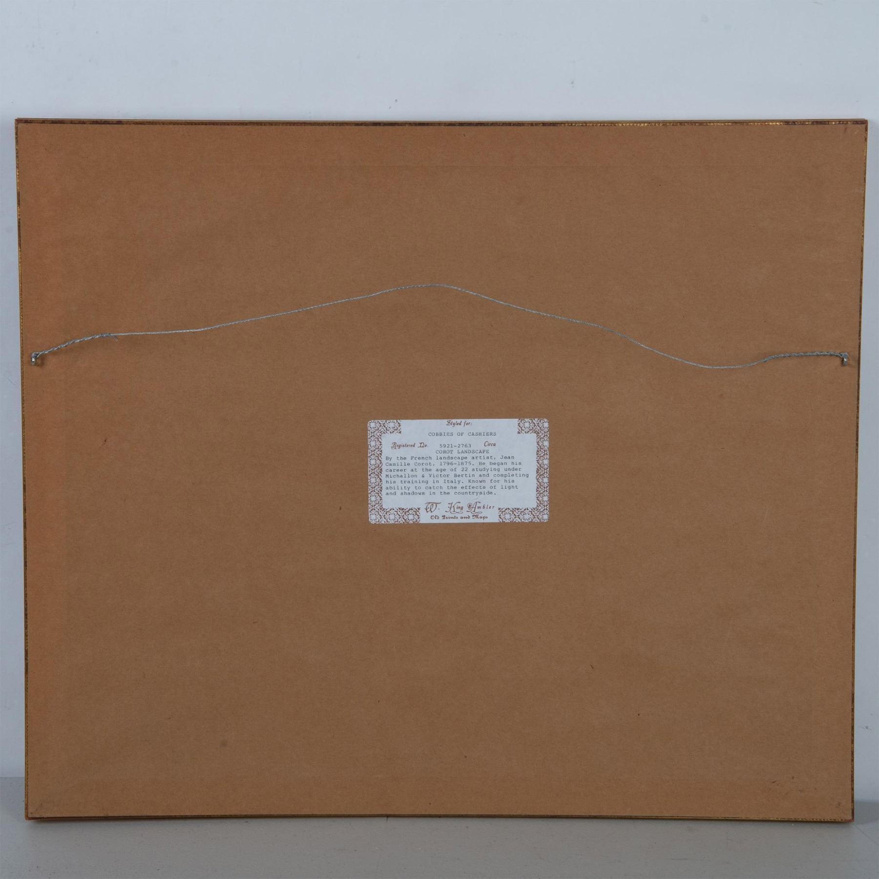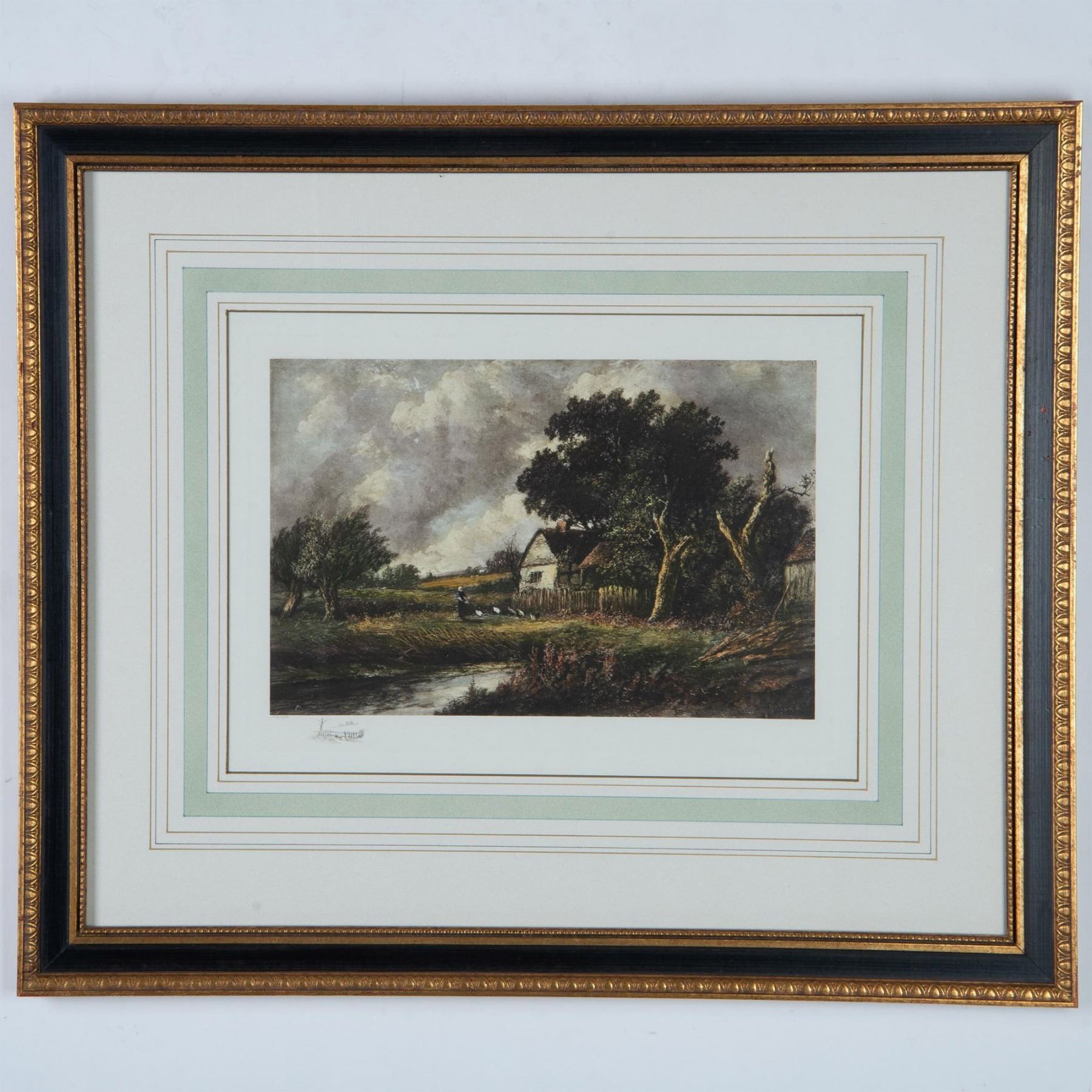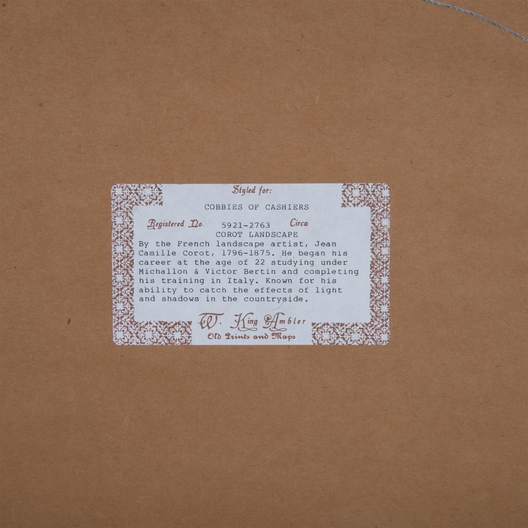 Finely colored original lithograph on laid paper that depicts a French countryside house in the style of Jean-Baptiste Camille Corot and the Barbizon School. Stamp on verso: Styled for Cobbies of Cashiers. W. King Ambler Old Prints and Maps. Includes a small biography on Corot. Signature in plate on lower right: illegible. Housed in a gilt and black frame with an off-white and light green mat. Sight dimensions: 13.75"L x 10"H. Frame size: 23"L x 19.50"H x 1"W. Artwork can be unframed and rolled for shipment.