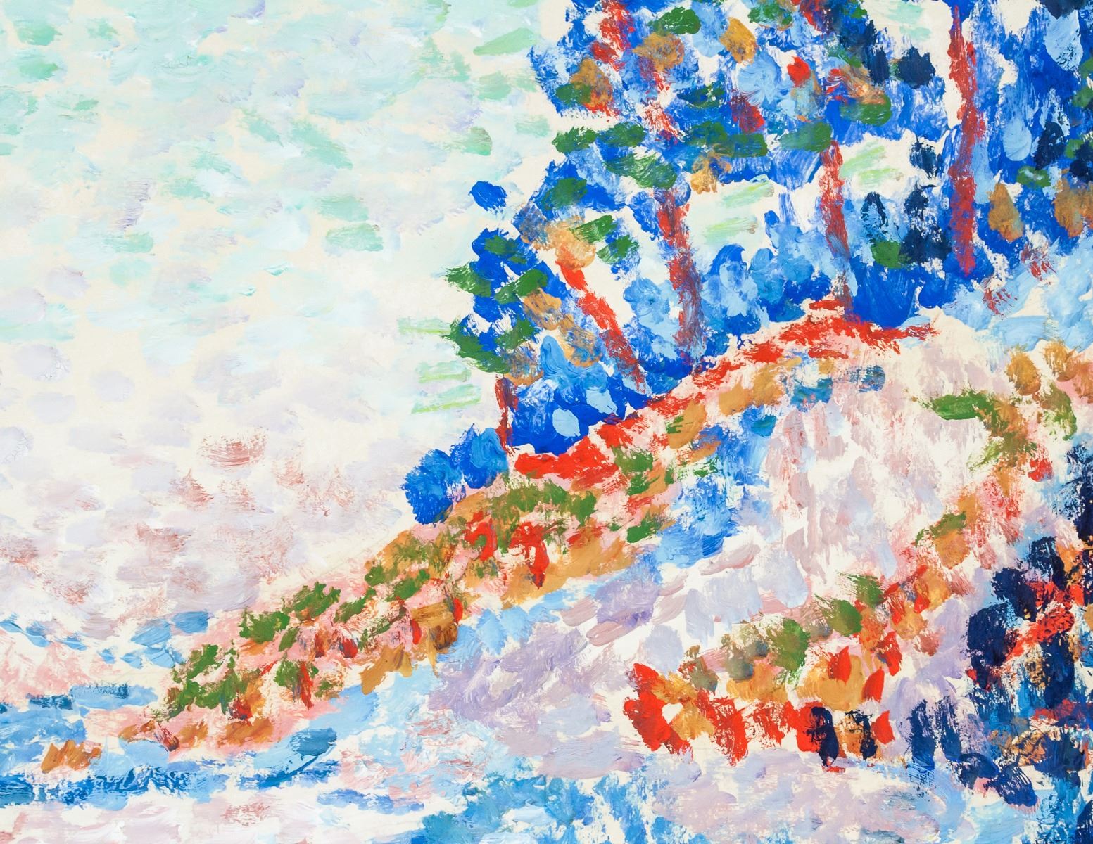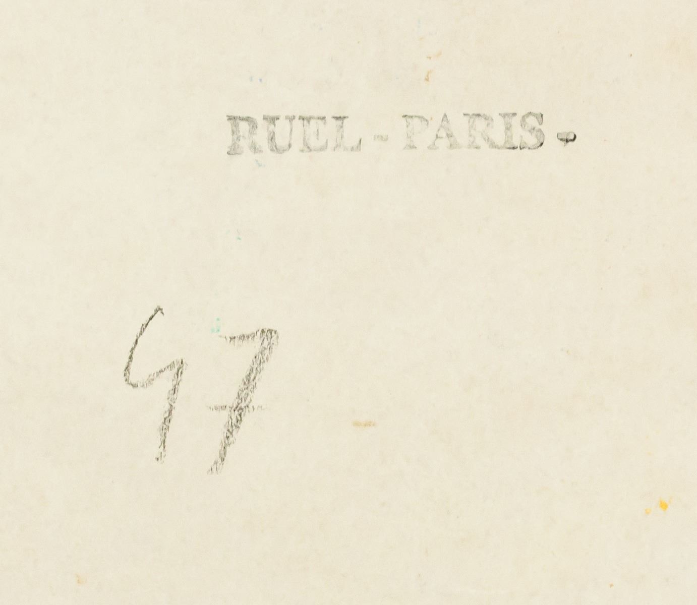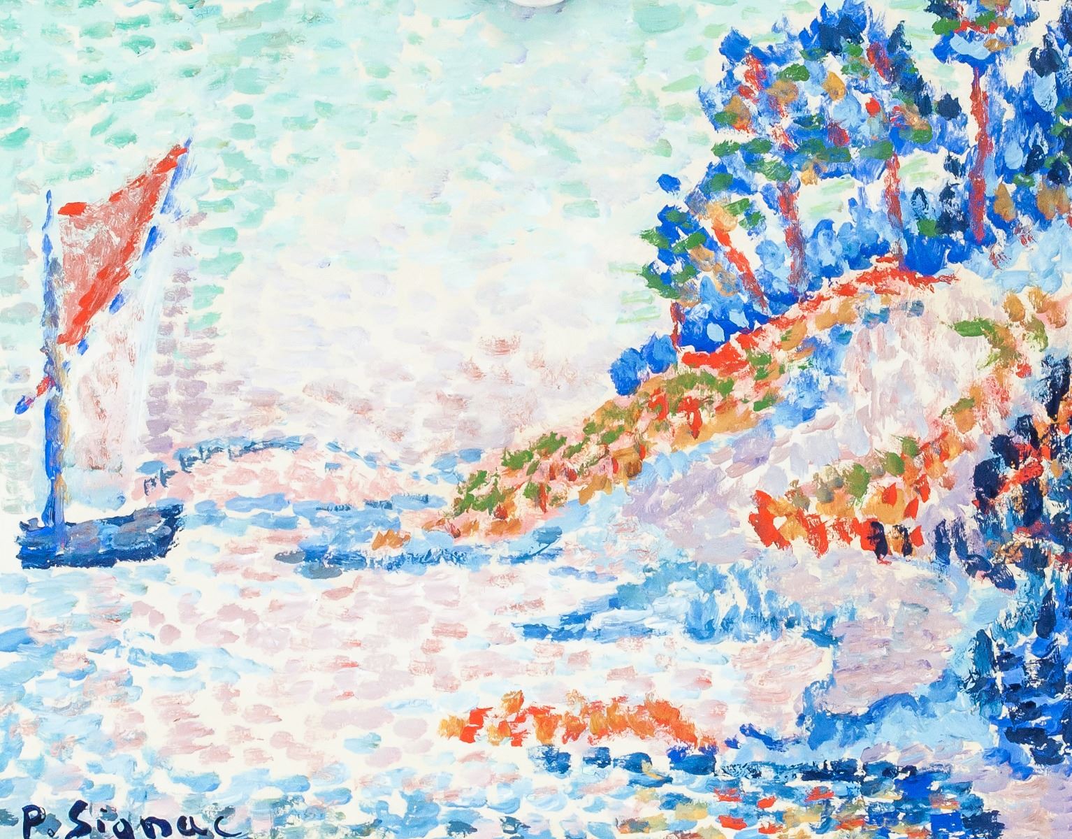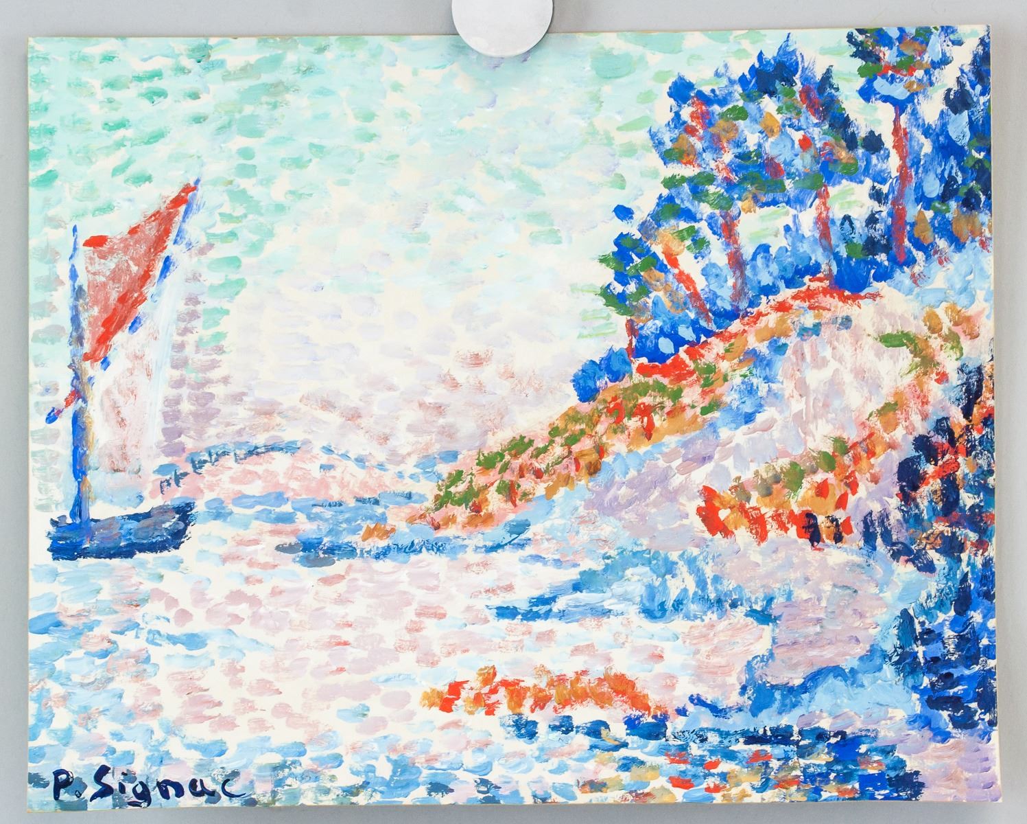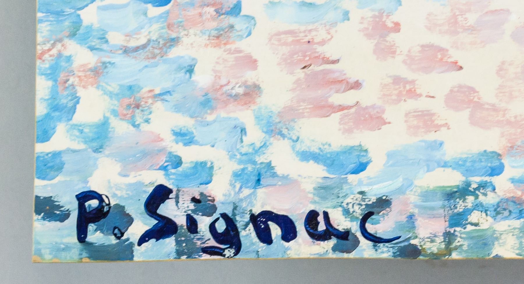 Oil on paper. Featuring a landscape scene in the impressionist style. Signed "P. Signac" in the bottom left corner. "97" inscribed on verso. Stamped with "RUEL-PARIS-" on verso. Style of Paul Signac (1863-1935, French). 19 x 24 cm (7.5 x 9.5 in). Provenance: This lot carries limited provenance from a Southern Ontario estate