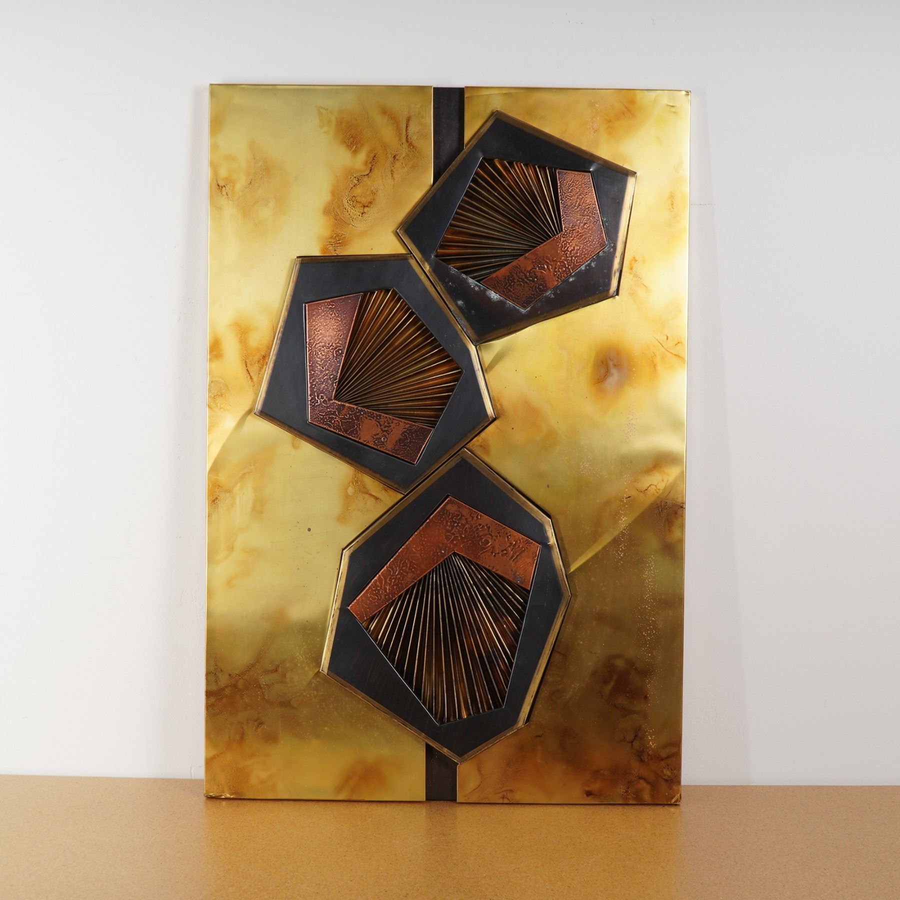 A striking mid century modern mixed metal wall sculpture crafted in brass, copper, and blackened steel, designed in the style of Stephen Chun. This dynamic piece features three geometric relief forms, each combining fan-like radiating ridges with richly textured copper panels, mounted on a warm, patinated brass ground. The interplay of polished, hammered, and oxidized surfaces creates an energetic sense of depth and movement, reflecting the bold, architectural aesthetics associated with Chun's work. Mounted on a wood backing with wire for wall display, this sculpture exemplifies mid century design's fusion of modernism and craft.