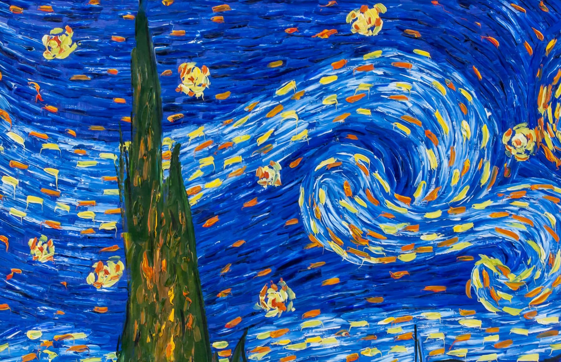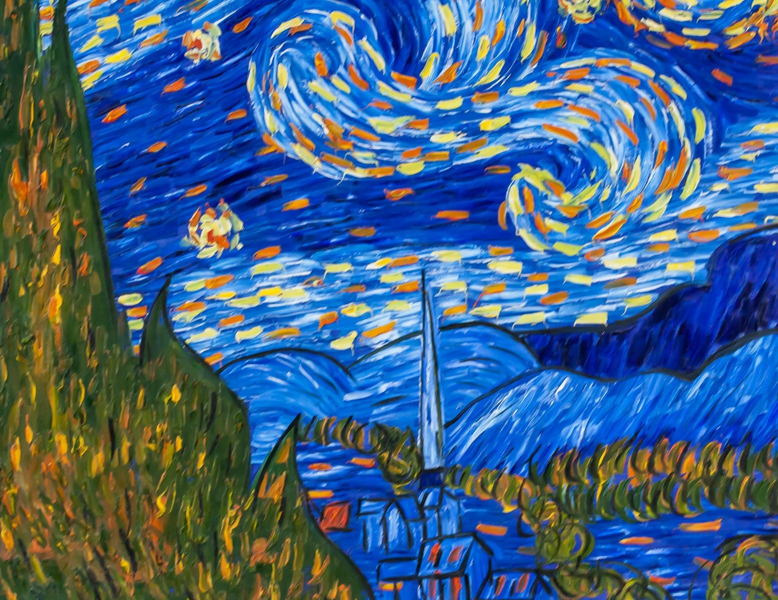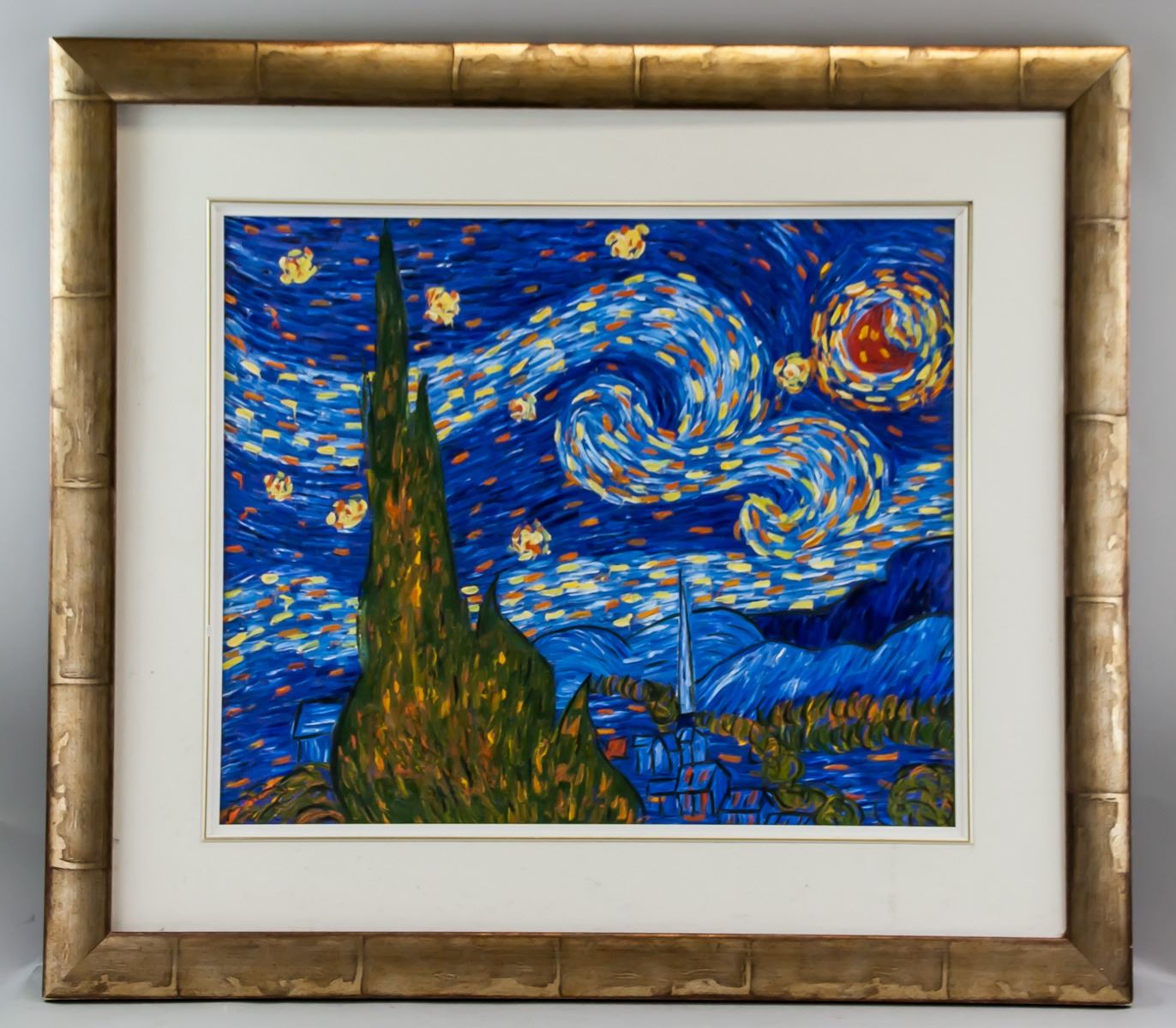 Acrylic on canvas, framed. Featuring the Starry Night in the style of Vincent van Gogh. 51 x 61 cm (20 x 24 inches), Framed 78 x 88 cm (30 x 34 inches). PROVENANCE: Tane Art Gallery (Toronto, ON)