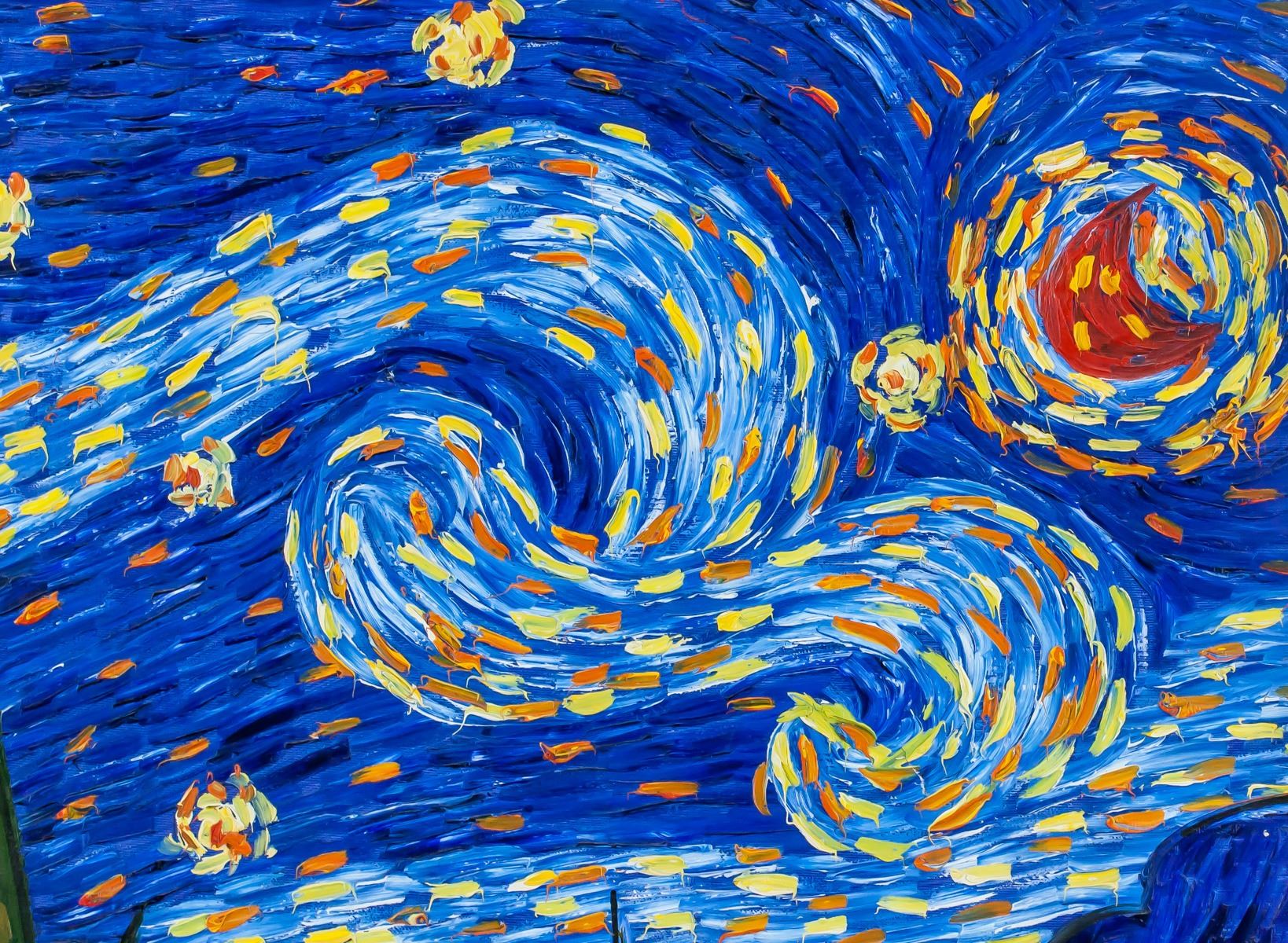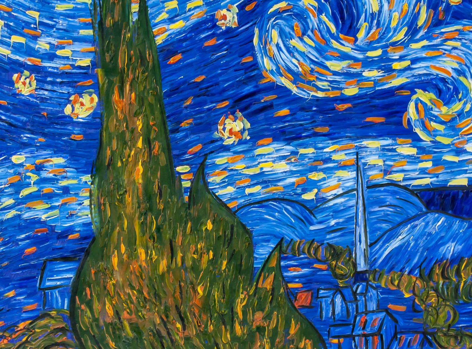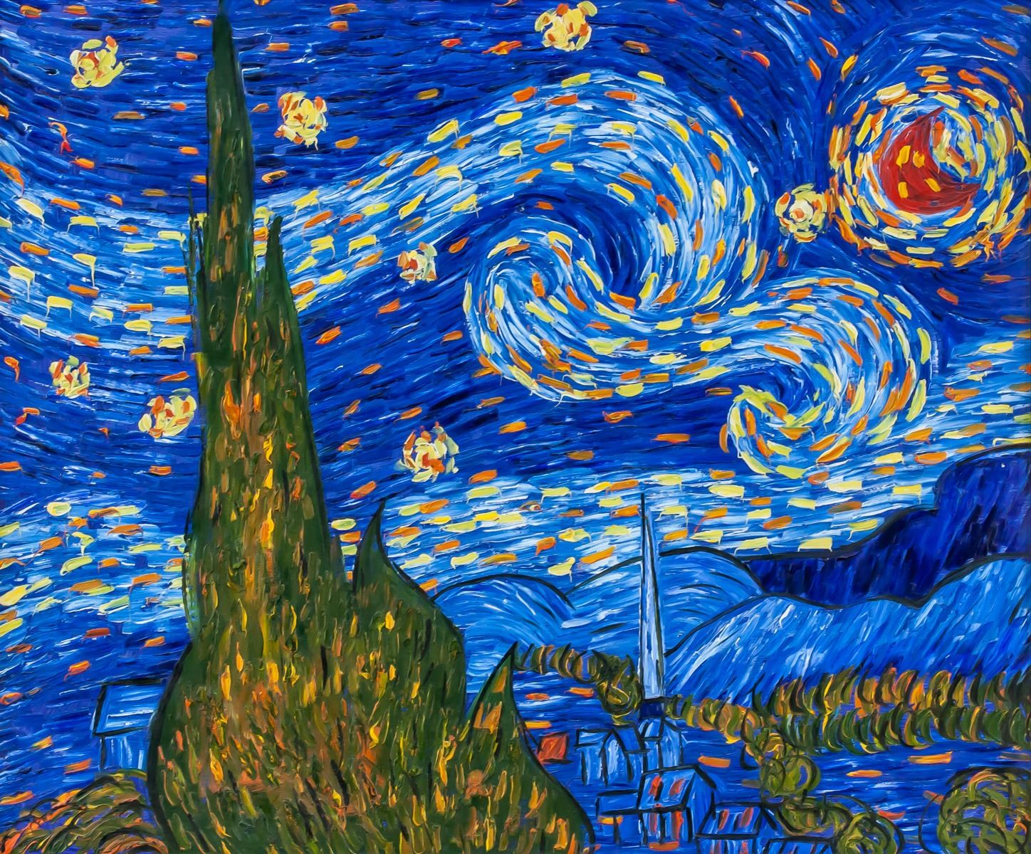 Acrylic on canvas, framed. Featuring the Starry Night in the style of Vincent van Gogh. 51 x 61 cm (20 x 24 inches), Framed 78 x 88 cm (30 x 34 inches). PROVENANCE: Tane Art Gallery (Toronto, ON)
