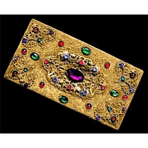 This outstanding ornate jeweled ormolu or brass jewelry box was produced in Czechoslovakia during the early years of the 20th century. The intricate and exquisitely detailed finely raised filigree designed lid is mounted with thirty five glass jewels of varying sizes, is highlighted with a large centered oval glass amethyst stone, and is further adorned with an ornate Fleur-Di Lis medallion on each corner and one large oval medallion in the center. The box has a similar intricate, exquisitely detailed finely raised filigree design and has a teak lining, which is rare. Measure 6 1/2 inches x 3 1/2 inches x 2 inches tall and is in excellent condition for its age.