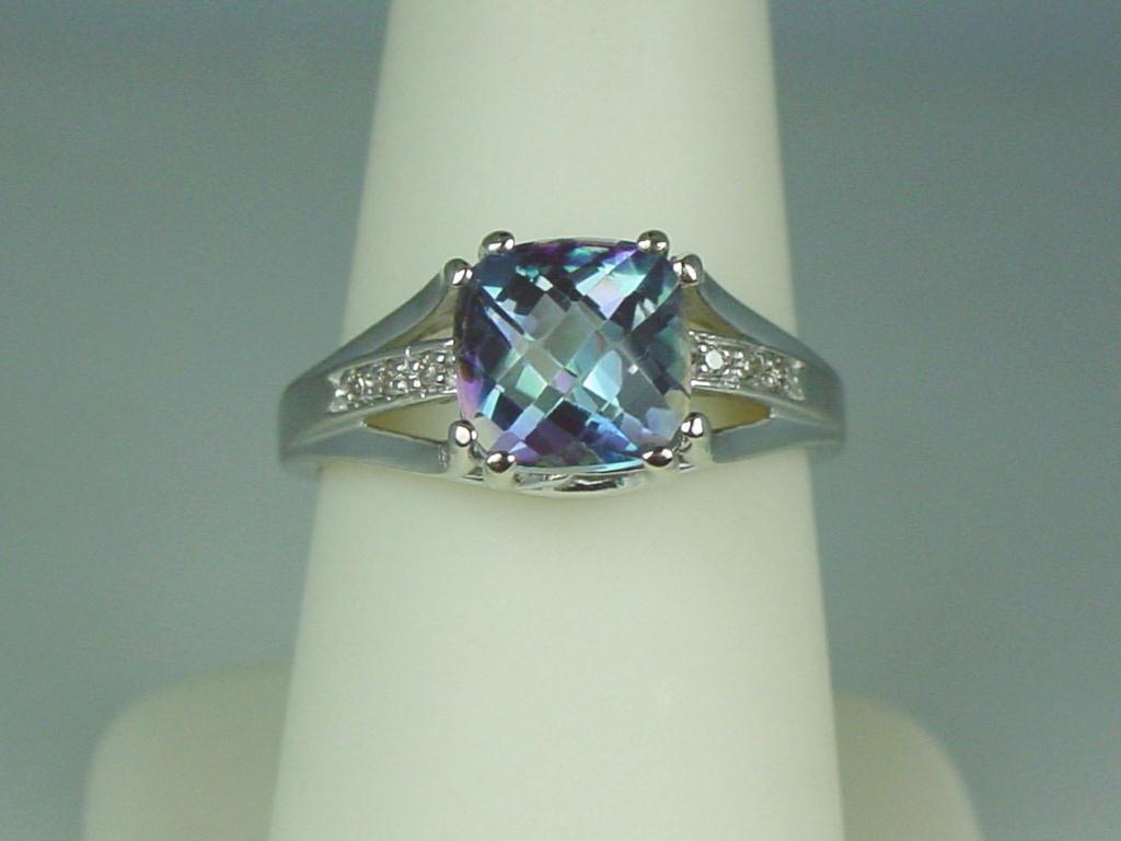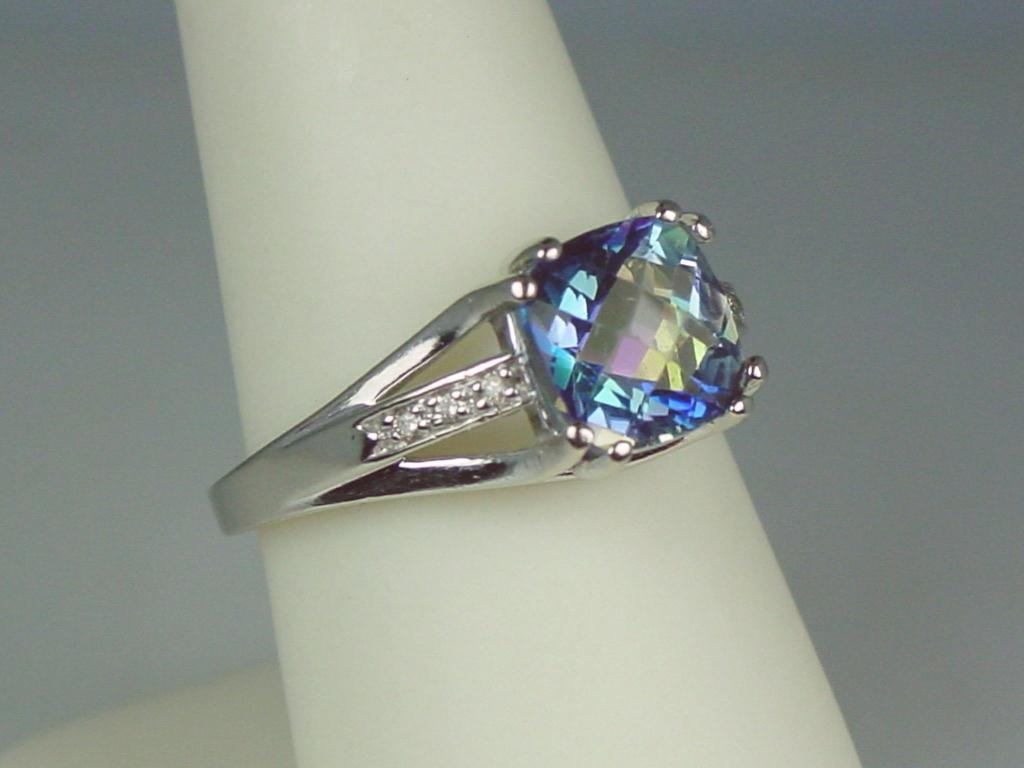 Stylish 10K White Gold Ladies Ring Set with a center checkerboard cut Mystic Topaz weighing approx 2.00 carats and six side pave set diamonds of G-H colors and SI clarity. Retail $795.00Set with a center checkerboard cut Mystic Topaz weighing approx 2.00 carats and six side pave set diamonds of G-H colors and SI clarity. Retail $795.00