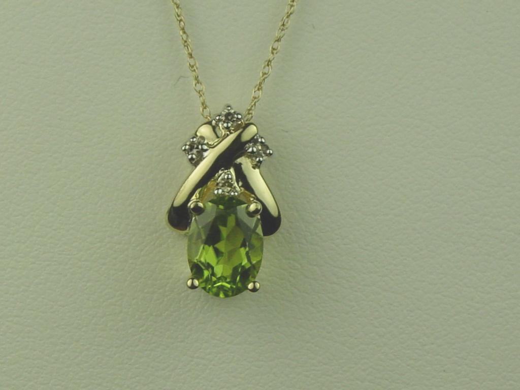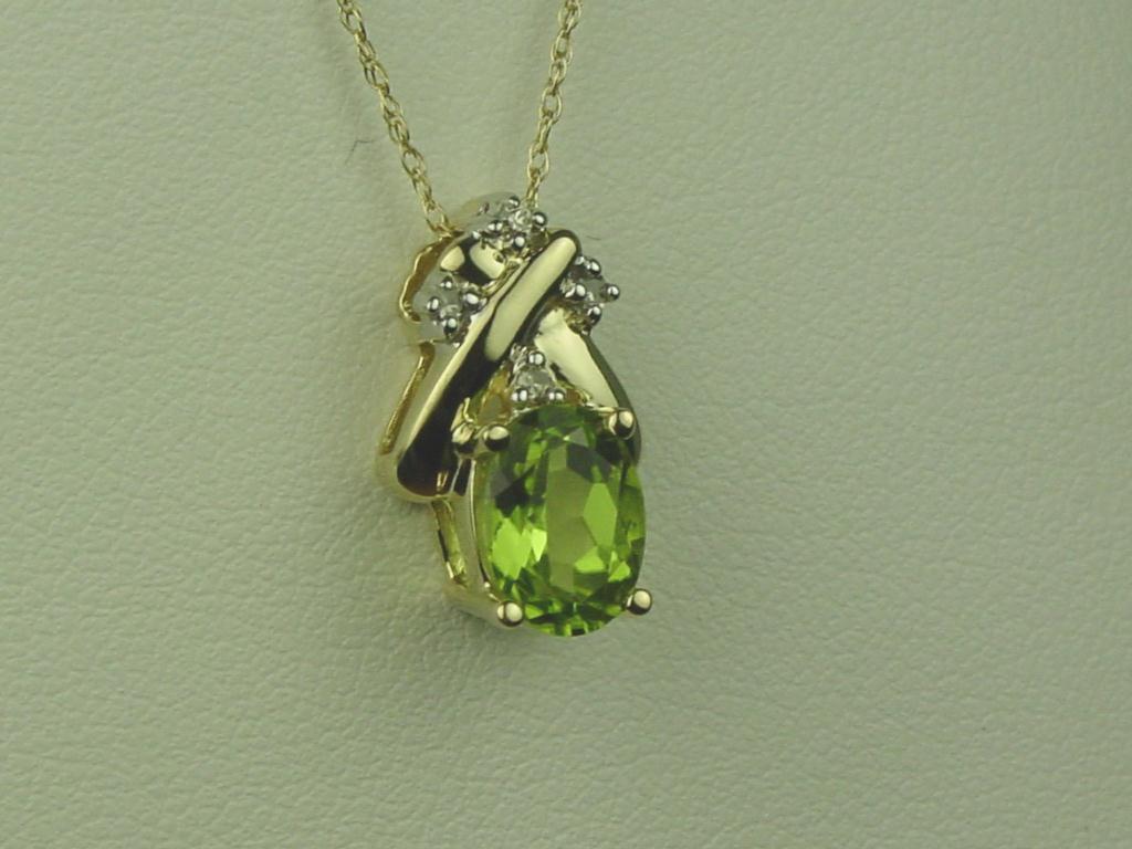Stylish 10K Yellow Gold Ladies Pendant Set with a fine center oval Peridot weighing approx 2.00 carats and 4 side diamonds. Retail $995.00Set with a fine center oval Peridot weighing approx 2.00 carats and 4 side diamonds. Retail $995.00