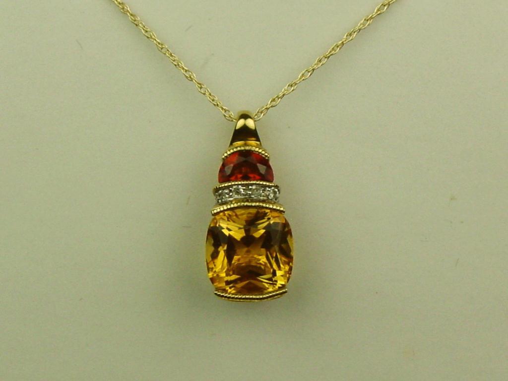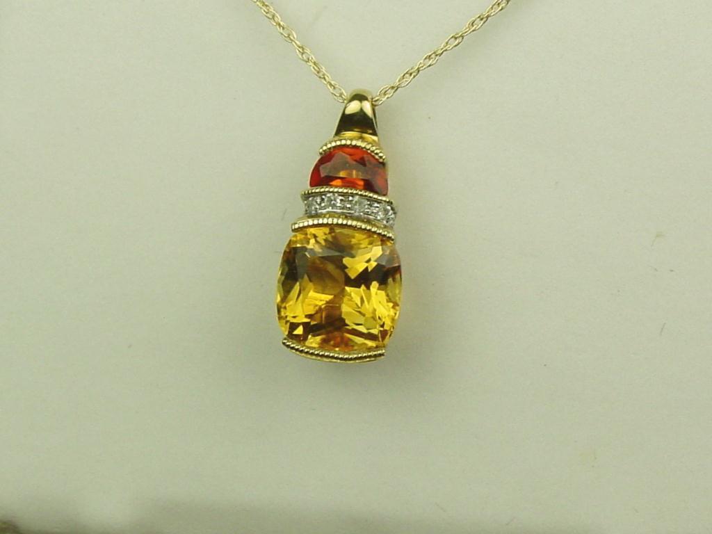 Stylish 10K Yellow Gold Ladies Pendant Set with an intense orange color Citrine weighing over 2.00 carats and side citrine and pave set diamonds. Retail: $995.00Set with an intense orange color Citrine weighing over 2.00 carats and side citrine and pave set diamonds. Retail: $995.00