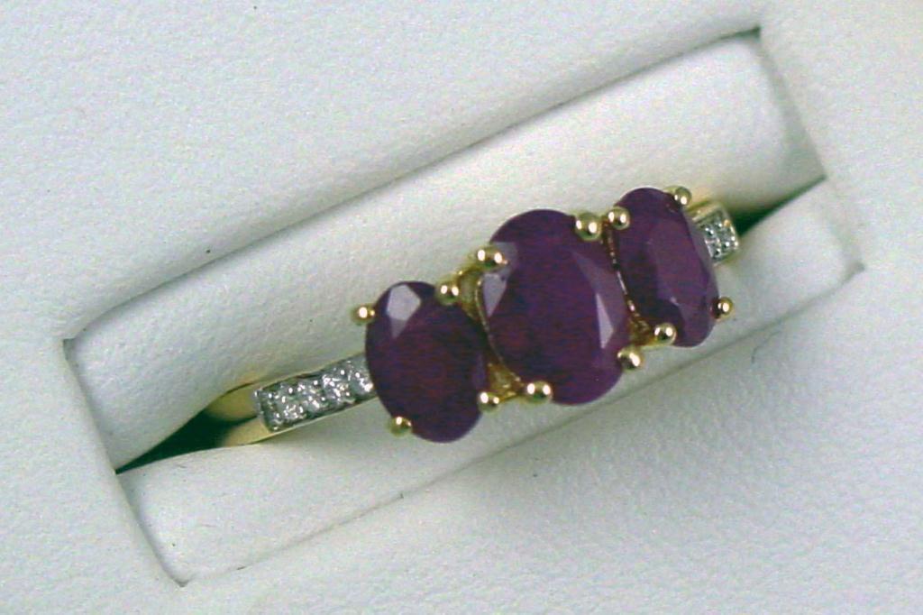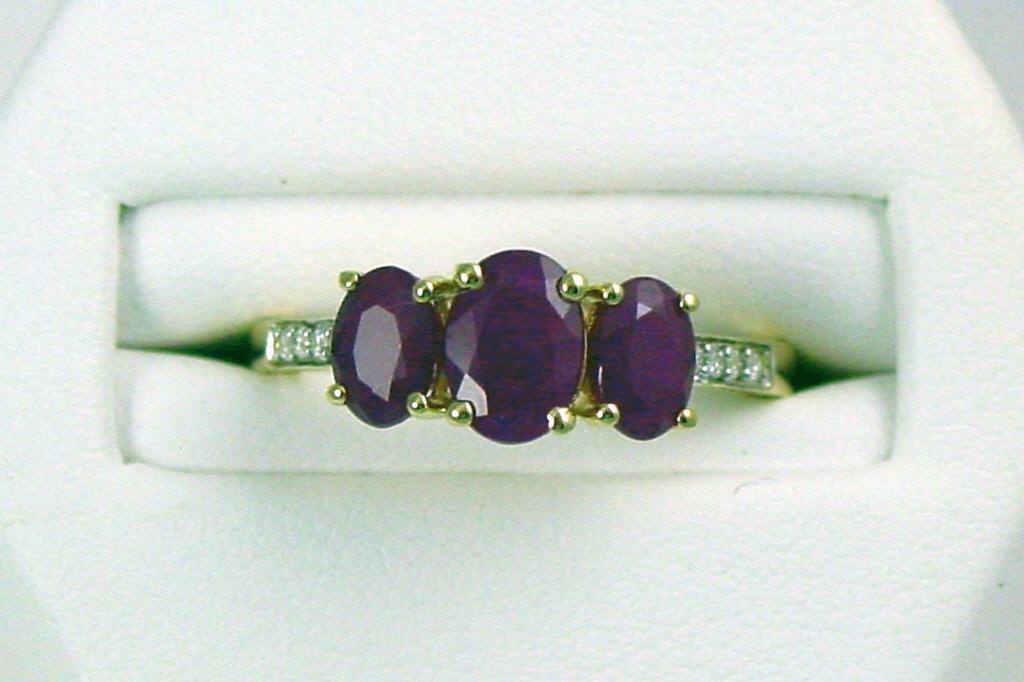 Stylish 10K Yellow Gold Ladies Ring Set with three red rubies weighing over 2.00 carats and eight side pave set diamonds. Retail $850.00Set with three red rubies weighing over 2.00 carats and eight side pave set diamonds. Retail $850.00