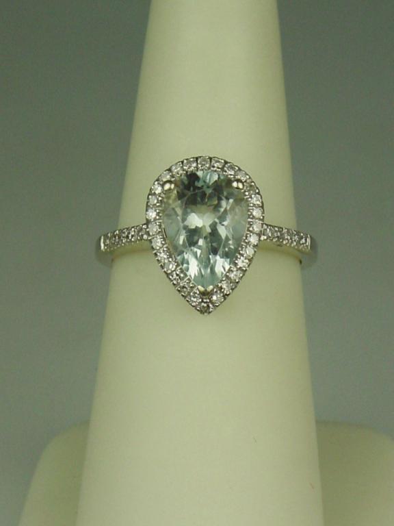 Stylish 14 karat white gold ladies ring set with a center pear shape Aquamarine weighing approx. 3.00 carats and pave set with over 38 round diamonds weighing approx. 0.40 carats of G-H colors and VS/SIclarity. Retail $1,950.00 Estimate $600-$800
