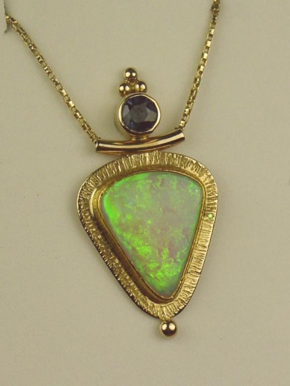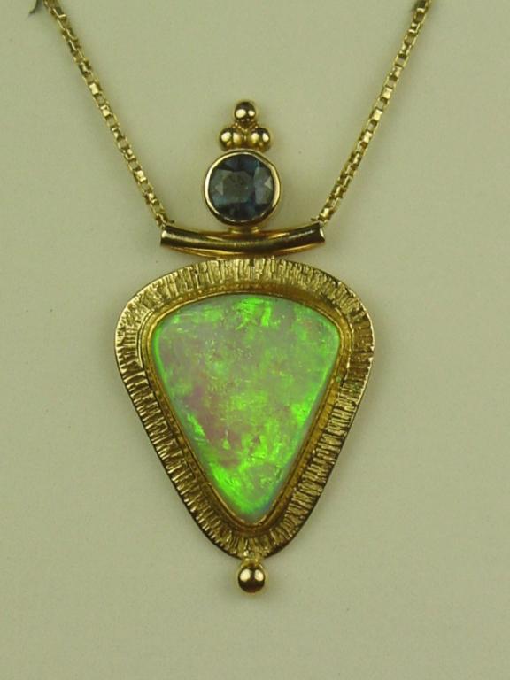 Stylish 14 karat yellow gold ladies custom made pendant bezel set with a very fine play of color Australian opal weighing approx. 3.00 carats and a bezel set blue zircon. Retail $2,450.00 Estimate $800-$1,200
