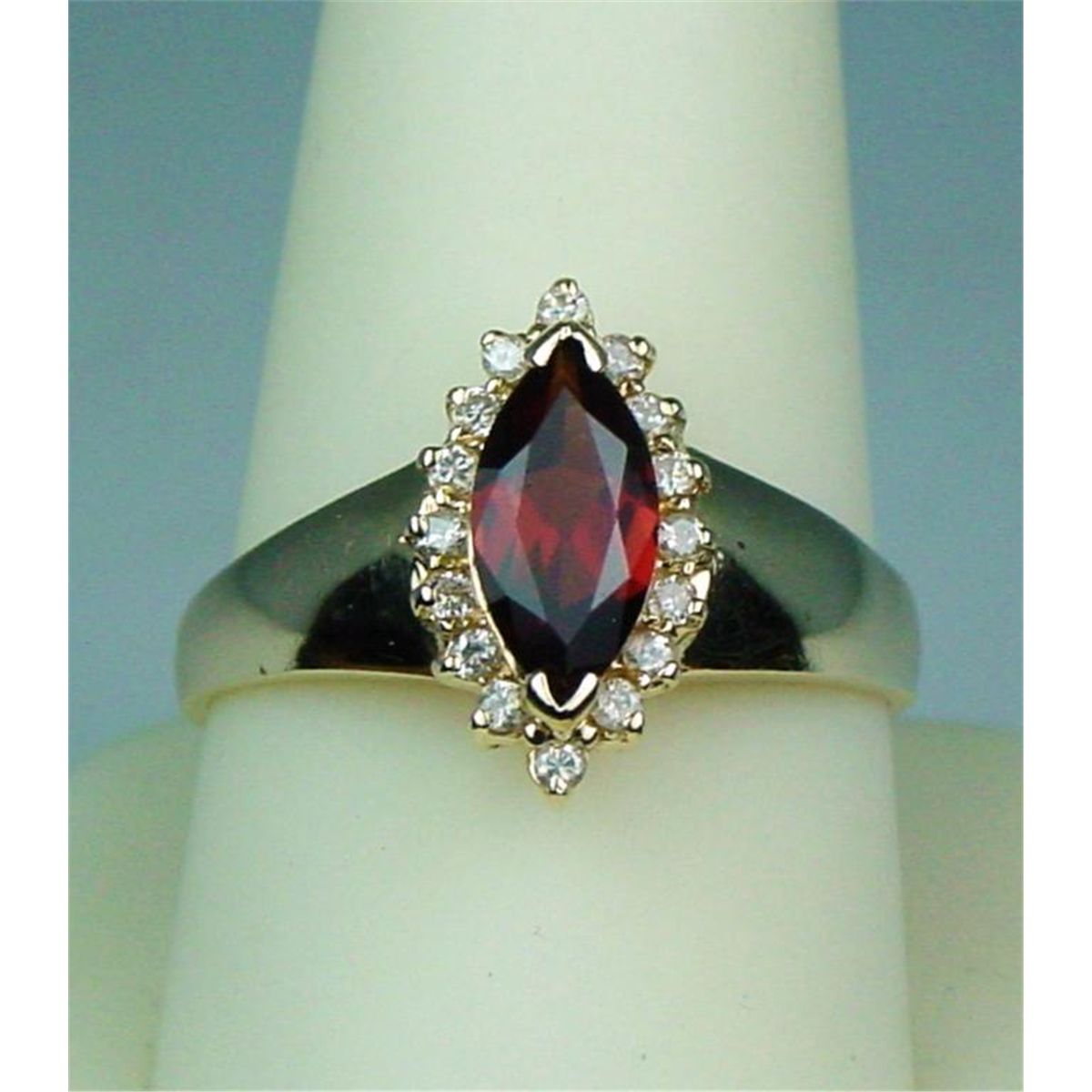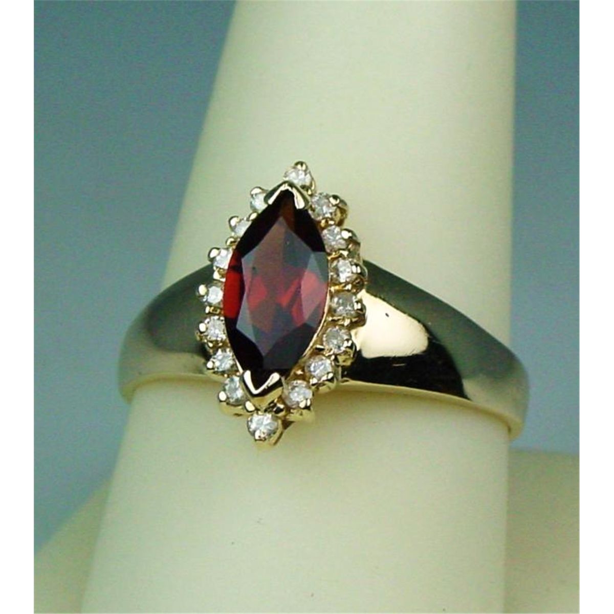 Stylish 14 karat yellow gold ladies ring set with a center MQ cut garnet weighing approx. 2.00 carats and surrounded by 16 round brilliant cut diamonds weighing approx. 0.30 carats of H-I colors and SI clarity. Retail$1,850.00 Estimate $600-$900