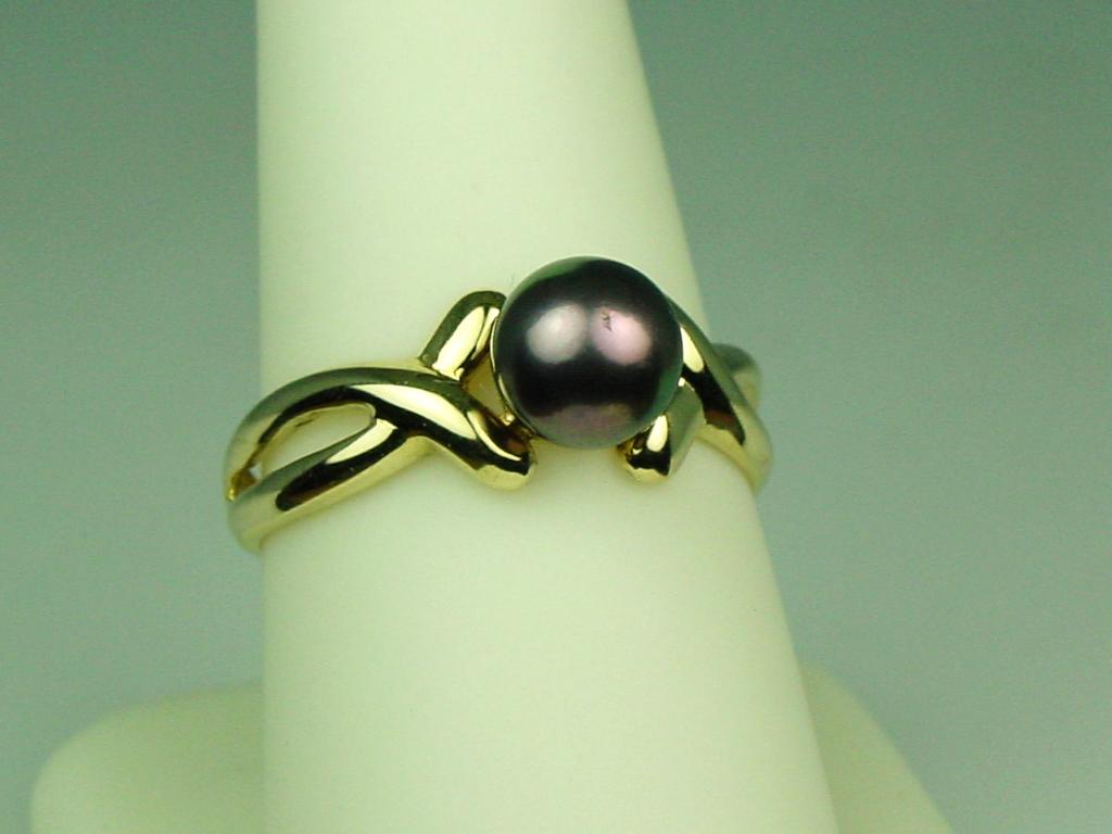 Stylish 14 karat yellow gold ladies ring set with a center round black pearl averaging 7.00MM in diameter. Retail $850.00 Estimate $300-$500
