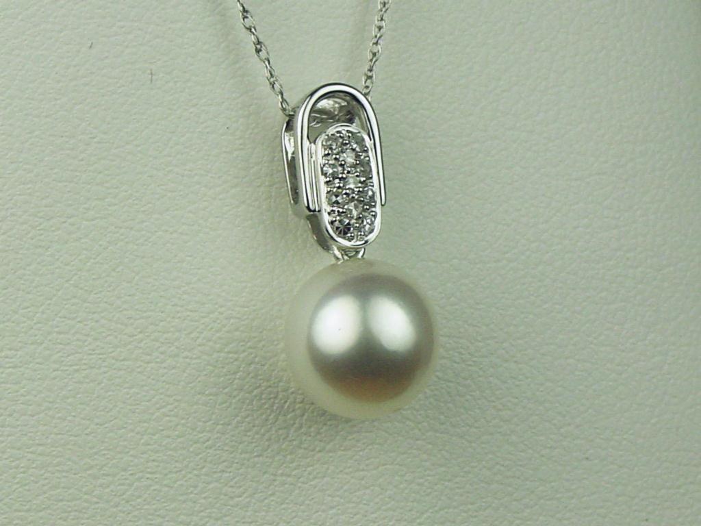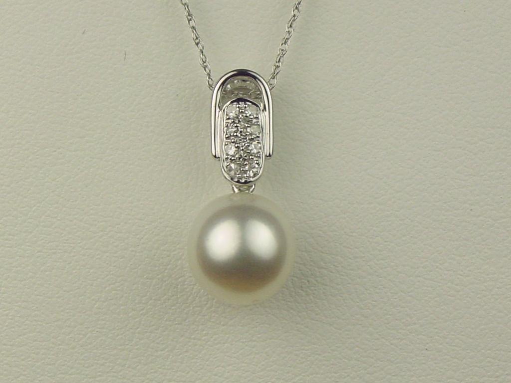 Stylish 14K White Gold Ladies Pendant Set with a center round pearl averaging 9.00mm in diameter and pave set with 11 round diamonds weighing approx 0.15 carats of G-H colors and VS/SI clarity. Retail $1,150.00Set with a center round pearl averaging 9.00mm in diameter and pave set with 11 round diamonds weighing approx 0.15 carats of G-H colors and VS/SI clarity. Retail $1,150.00