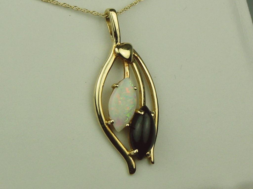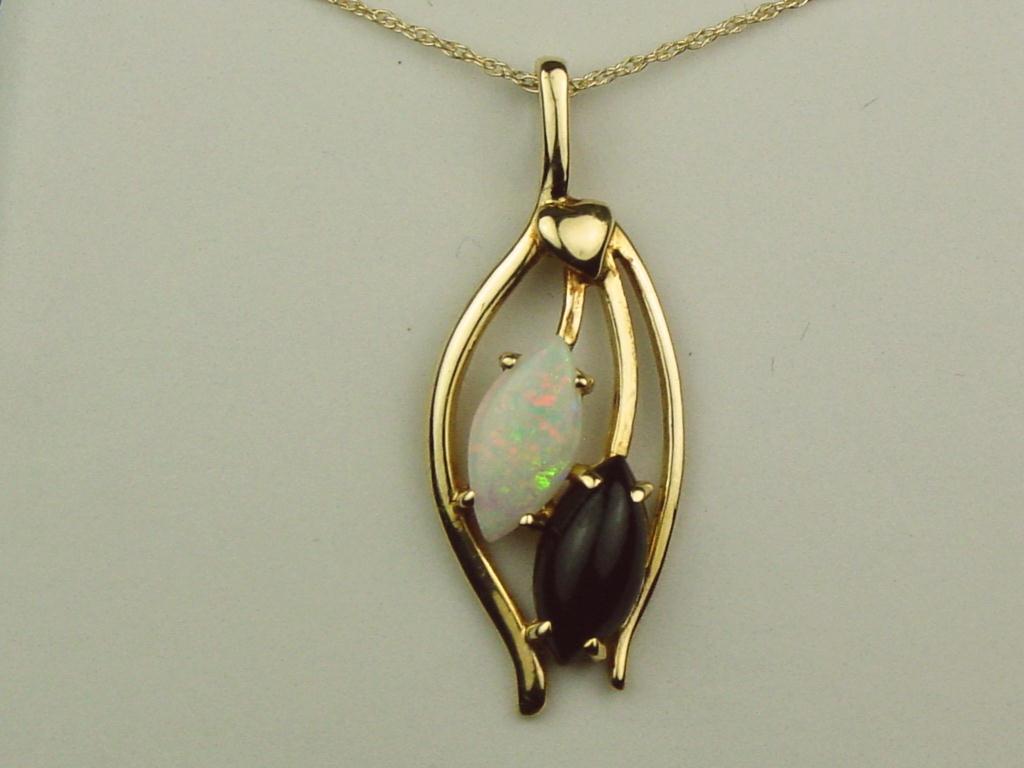 Stylish 14K YG Ladies Custom Made Pendant Set with fine matching MQ shape Opal and black onyx. Retail: $750.00Set with fine matching MQ shape Opal and black onyx. Retail: $750.00