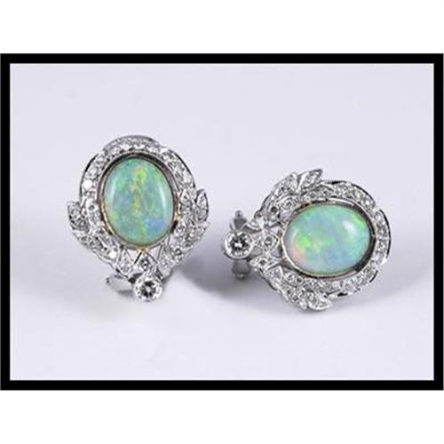 Fashionable earrings with 2 oval cut opals that weigh 3.79 carats, 2 brilliant cut diamonds that weigh approximately 0.20 carats, and 62 full cut diamonds that weigh 0.51 carats set in 18K white gold. The earrings measure 19.4 millimeters (0.76 inches) long x 16.3 millimeters (0.64 inches) wide and weigh 9.40 grams total weight.